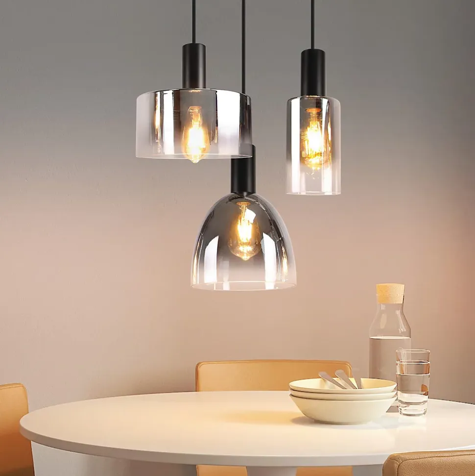[Design unique] cette suspension de table à manger en verre est composée d’un cadre métallique robuste et d’un abat-jour en verre de haute qualité, solide et durable. Et les abat-jour sont de différentes formes, adaptées à différents styles d’intérieur, créant une atmosphère luxueuse et harmonieuse. L’abat-jour du lustre est en verre noir mat, gris anthracite, avec un effet de dégradé qui distribue la lumière de manière plus uniforme et donne de la profondeur et des couches à la pièce.[Taille & matériau] la taille de l’abat-jour en verre de gauche à droite est de 25*25*12cm, 20*20*18cm, 10*10*18cm ; la taille du cadre métallique du disque de plafond : 55*5*2.5cm ; la longueur du fil suspendu : 150cm ; ce lustre de restaurant est fabriqué en fer et en verre de haute qualité, qui ne rouille pas facilement, est facile à installer et à nettoyer.[Base e27 & hauteur réglable] cette suspension de salon est livrée avec 3 bases d’ampoules e27, les ampoules ne sont pas incluses. La suspension peut être remplacée de manière flexible par différentes sources lumineuses e27 afin de répondre aux besoins des clients en matière de bricolage. La puissance maximale de l’ampoule est de 25w et la tension applicable est de 230v. Entre-temps, le câble réglable de la lampe suspendue est long de 150 cm et peut être ajusté en fonction de la hauteur de suspension de la lampe.[Facile à installer] cette suspension est livrée avec un guide d’installation détaillé et tous les accessoires nécessaires, même sans outils professionnels, l’installation peut être facilement complétée. La surface du verre est lisse et facile à nettoyer, ce qui peut réduire l’entretien.[Wide use] cette lampe suspendue en verre à gradient pour table à manger est adaptée pour la chambre à coucher, le salon, la cuisine, la salle à manger, le couloir, le café, le bureau, l’hôtel et d’autres scènes, c’est un dispositif d’éclairage fonctionnel idéal.Caractéristiques et avantages