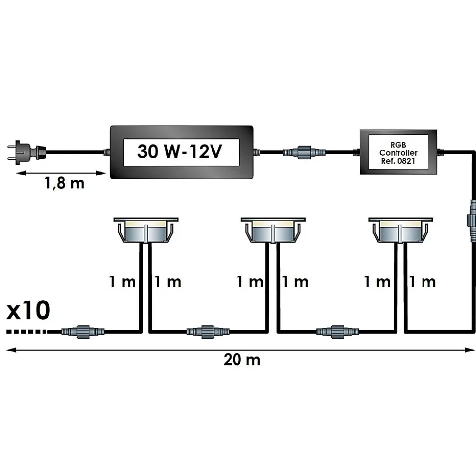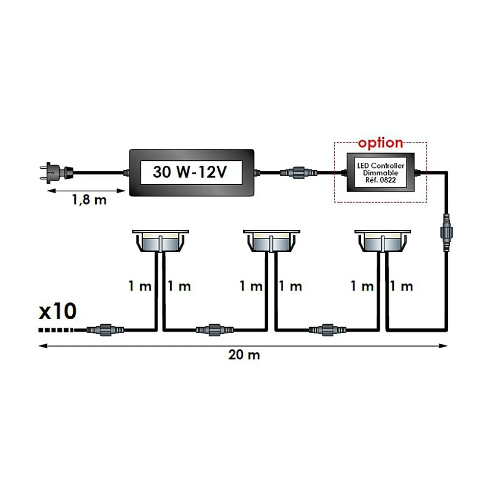 - – ETENDABLE – Chaque spot est pourvu de deux câbles d’un mètre, ce qui offre la possibilité de créer une série de dix spots sur une distance de 20 mètres. Cette configuration flexible permet d’ajuster aisément le nombre de spots en fonction des dimensions de votre terrasse.