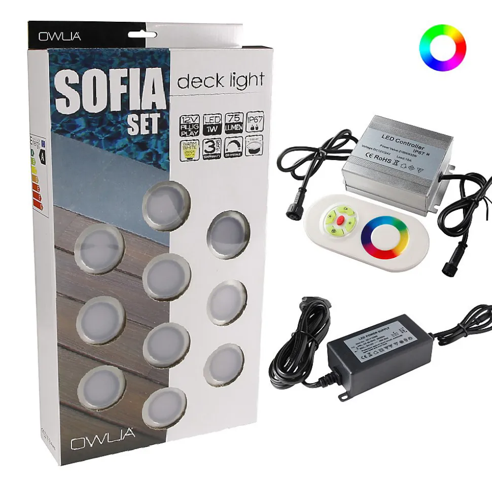SOFIA : SPOT LED À ENCASTRER DIAMÈTRE 45MM – COULEUR RGBLe kit de spots SOFIA RGB comprend les éléments suivants :10 Spots de couleur (RGB) : avec télécommande RGB Ref HEL011 et transformateur inclus.Chez Owlia, nous garantissons nos produits pendant 3 ans, et les spots ont une durée de vie impressionnante de 50 000 heures, assurant ainsi d’innombrables soirées en famille ou entre amis.La couronne extérieure est en Inox 304. Pour prévenir l’apparition de légères traces de rouille en surface, un entretien régulier est nécessaire.INSTALLEZ TRES SIMPLEMENT LE KIT SOFIA EN MODE PLUG & PLAYChaque spot est équipé de deux câbles de 1 mètre, que vous pouvez connecter les uns aux autres en quelques minutes. Cette technologie garantit la protection IP67, donc évitez de serrer trop fort les connexions. Des détrompeurs sont également présents sur chaque prise pour éviter toute erreur d’installation.Nous vous recommandons de dessiner un plan pour visualiser votre circuit et identifier d’éventuelles contraintes. Si nécessaire, utilisez des rallonges pour faciliter l’installation. Pour percer vos lames, respectez le diamètre indiqué : 31 mm. Les câbles ont un diamètre de 5 mm et les raccords de 15 mm.CARACTÉRISTIQUES TECHNIQUESDiamètre (Ø) : 45mmCouleur LED (Kelvin) : RGB CouleurDiamètre de perçage (Ø) : 31 mmGarantie : 3 ansLongueur de câble : 2 x 1mIsolation : IP67Durée de vie LED (h) : 50 000Source lumineuse remplaçable : nonClasse énergie LED : A+Matériau de la plaque : PolycarbonateVoltage : 12VInstallation : Plug and PlayMatériau du corps : INOX (304)Nombre de spots max par installation : 20Ø câble / Ø raccord câble : 5mm – 15mmWatt : 0.5Lumen : 12Transformateur : Oui