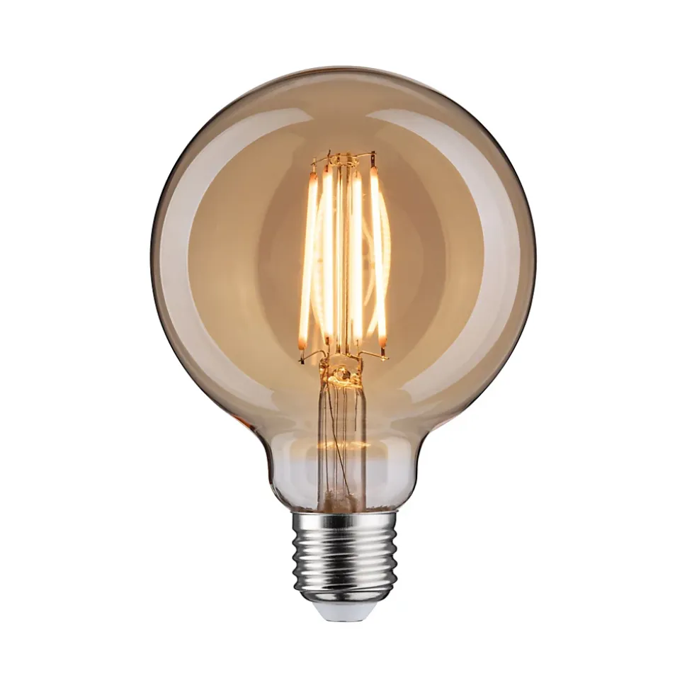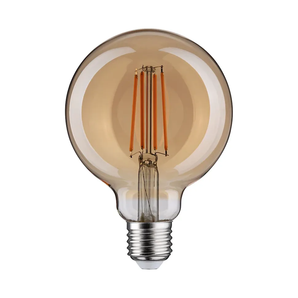 Farbtemperatur: 1.800K – Goldlicht|Lumière chaude et chaleureuse dans le style du filament de carbone|Retro-Globe dans un look Vintage tendance|Finition à lustre doré|Intensité variable|Technique LED efficace|Température de couleur: 1800K – lumière dorée