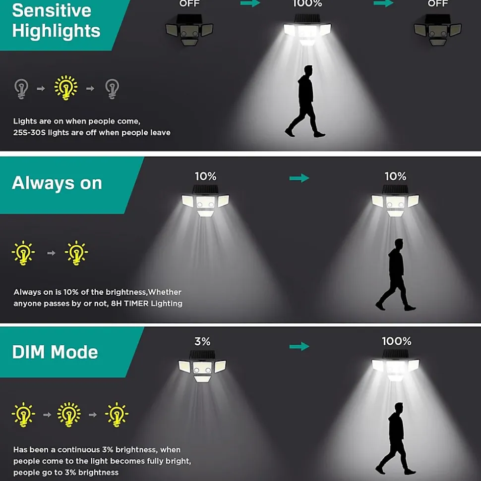 Le lot de 2 projecteurs solaires Fairview à 4 têtes orientables offre un éclairage extérieur blanc froid puissant de 700 lumens. Équipé de 188 LEDs ultra-lumineuses, chaque projecteur couvre un angle large de 270 degrés pour sécuriser vos allées ou jardins. Son détecteur de mouvement d’une portée de 6 à 8 mètrès propose 3 modes intelligents réglables. Sa batterie lithium de 2200 mAh assure une autonomie technique de 7 heures après une charge solaire de 6 à 8 heures grâce au capteur crépusculaire intégré. Certifié IP65, il résiste totalement à la pluie et aux intempéries pour un usage permanent. Sa structure robuste garantit une durée de vie technique allant jusqu’à 50 000 heures. L’entretien reste simple : un chiffon doux suffit pour conserver un rendu soigné au fil des saisons. Elle constitue aussi une excellente idée pour personnaliser une chambre, un salon ou un coin lecture avec une lumière cosy.
