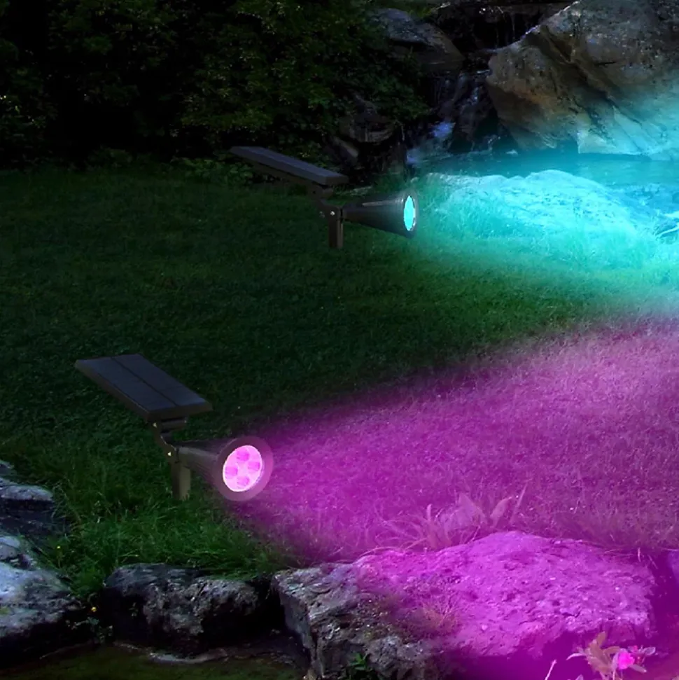 Pack de 2 spots solaires LUMISKY étanches (IP44) avec 4 LEDs RVB intégrées offrant 200 lm, tête pivotante 90°, autonomie 8–10 h après 6–8 h de recharge solaire, installation au sol ou murale, design noir mat durable.