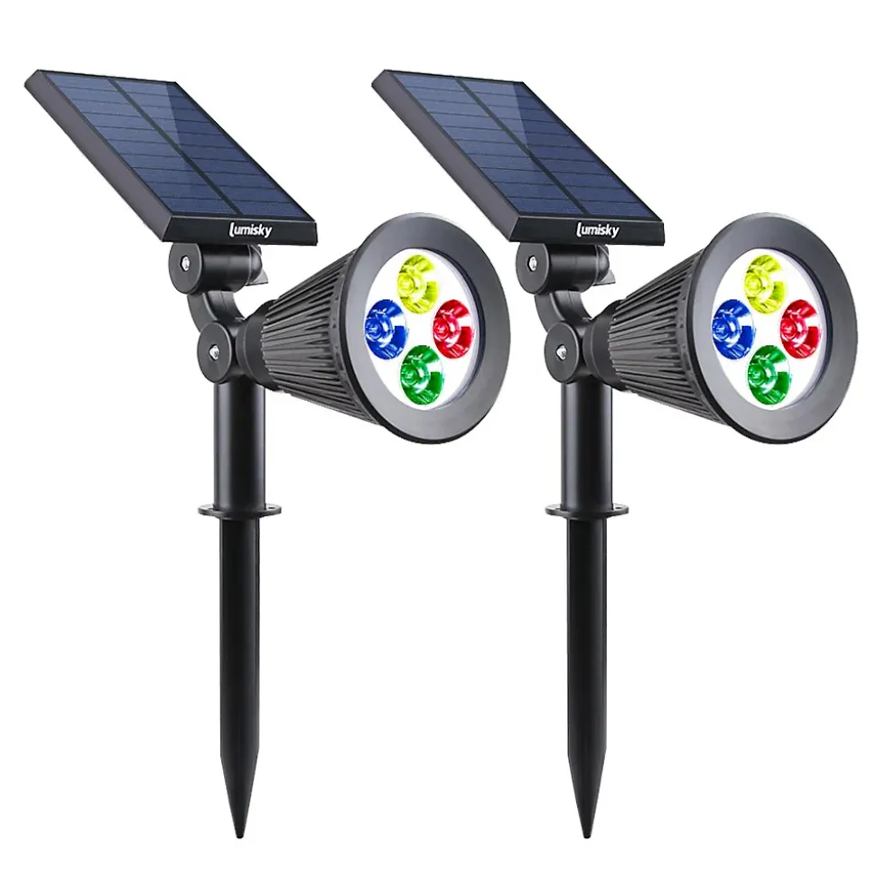 - Pack de 2 spots solaires étanches LUMISKY avec 4 LEDs RVB intégrées, flux lumineux 200 lm, autonomie 8–10 h, tête pivotante à 90°.