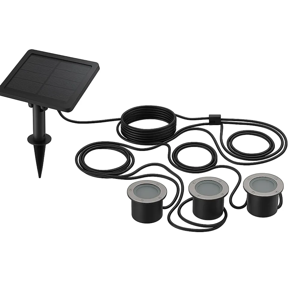 Le kit de 3 spots solaires Solpool constitue une solution d’éclairage extérieur blanc chaud (3000K) idéale pour le bord d’une piscine. Chaque spot délivre une intensité de 100 lumens pour créer une ambiance accueillante. Le système dispose d’un panneau solaire déporté avec capteur crépusculaire pour une autonomie optimale sans consommation électrique sur secteur. Le panneau peut se fixer au sol ou au mur grâce au kit fourni. Chaque luminaire est équipé d’un câble de 2,7 mètres relié au point de connexion central, permettant de positionner précisément vos points lumineux pour valoriser vos bordures, le diamètre d’encastrement est de 6 cm. Fabriqués en ABS avec un revêtement inox, ils sont certifiés IP44 pour résister aux intempéries et aux rayons UV saison après saison. Pour un effet encore plus chaleureux, combinez-la avec d’autres sources de lumière et variez les hauteurs d’installation.