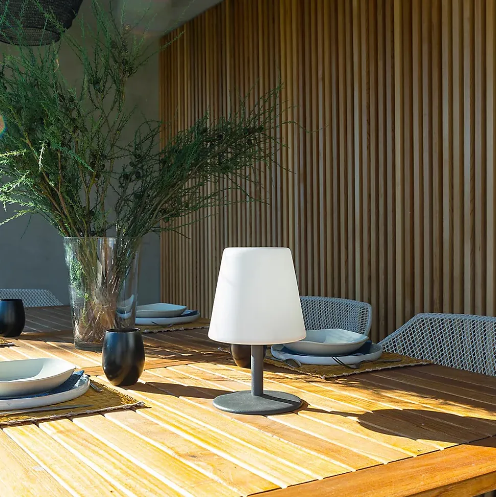 Le Lot de 4 Lampes de Table LED Sans Fil Standy Mini Rock offre une solution d’éclairage nomade au design moderne avec pied en acier gris brossé. Ces 4 lampes autonomes apportent une touche originale à votre décoration intérieure ou extérieure. Équipées d’une base LED blanc chaud/froid à intensité variable, elles proposent un flux de plus de 100 lumens adaptable. Leur batterie rechargeable offre une autonomie de 8 heures après une charge de 4 à 6 heures par câble USB. L’abat-jour en polyéthylène ø16x H25cm est certifié IP44 pour résister aux éclaboussures et aux rayons UV, idéal pour la terrasse ou les tables de fêtes. Profitez d’un éclairage nomade fiable avec une grande facilité d’entretien à l’eau tiède et au savon doux. Facile à intégrer à votre aménagement, elle apporte un point lumineux décoratif sans alourdir l’espace. Pour un effet encore plus chaleureux, combinez-la avec d’autres sources de.