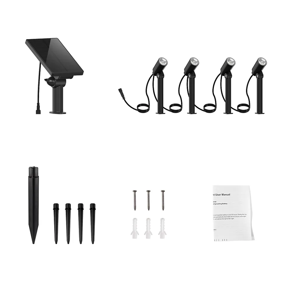 Le lot de 4 spots solaires LED Mini Roundy propose un éclairage extérieur blanc chaud de 3000K créant une atmosphère élégante. Chaque spot délivre une intensité de 100 lumens pour structurer vos allées ou jardins. Équipé de batteries lithium 18650 de 2200 mAh et d’un panneau solaire monocristallin de 2W, ce système assure une autonomie technique de 8 à 12 heures après une charge de 4 à 5 heures. Certifiés IP65, ces luminaires sont totalement étanches à la pluie et à la poussière pour un usage fiable toute l’année. Le câble total de 2, 5 mètrès permet un positionnement flexible des spots autour du panneau central. Leur finition noire moderne s’intègre discrètement dans tout type d’aménagement extérieur. Pratique au quotidien, elle se déplace et se range facilement lorsque vous souhaitez libérer l’espace. Facile à intégrer à votre aménagement, elle apporte un point lumineux décoratif sans alourdir l’espace.