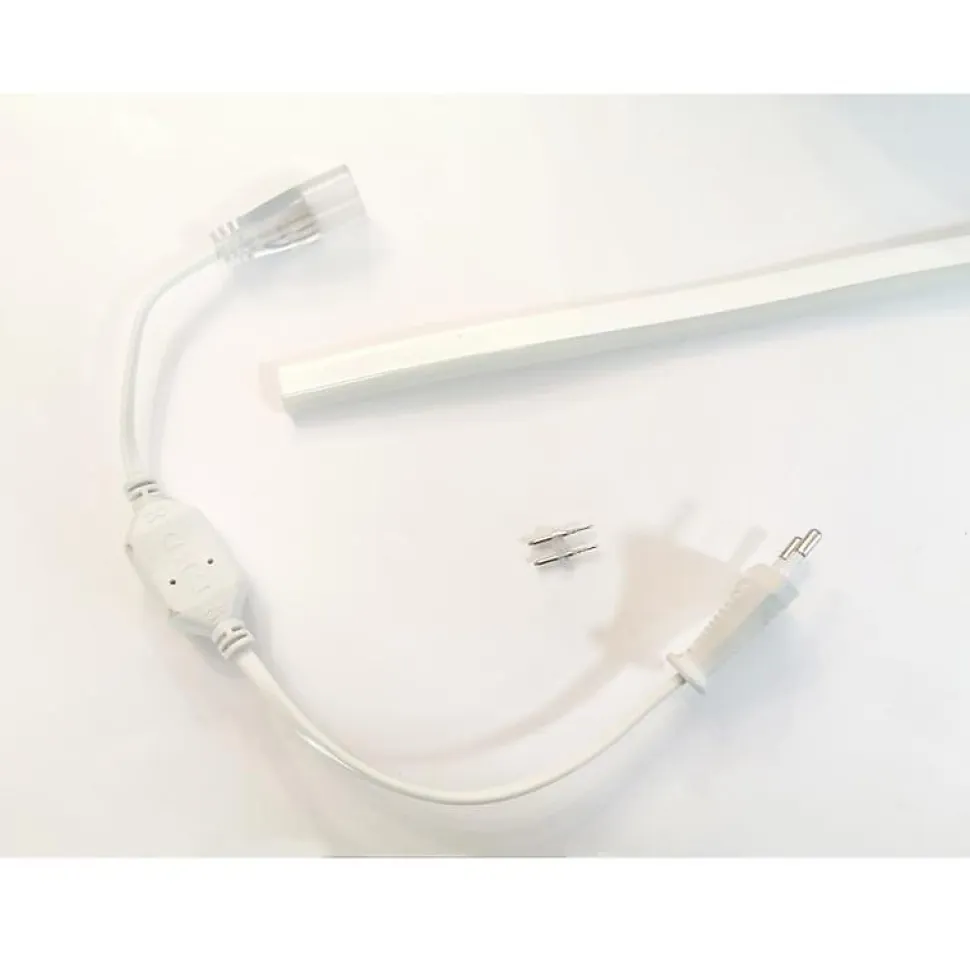 - Le Néon LED Flexible Dimmable est sécable tous les mètres au niveau des zones où apparaissent des ciseaux et inclus un redresseur avec son picot, un connecteur et un cache de protection.