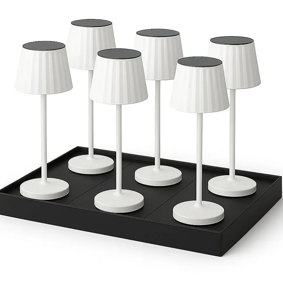 Ce lot de 6 lampes de table sans fil Abby White avec plateau de chargement multiple est la solution idéale pour coordonner l’éclairage de vos tables de restaurant ou de vos réceptions. Chaque lampe en aluminium blanc offre un design fin avec un abat-jour de 11 cm de diamètre et une hauteur totale de 29 cm. Le plateau de charge par contact inclus permet de recharger simultanément les 6 unités sans aucun câble gênant, simplifiant la gestion quotidienne de votre éclairage. Grâce au variateur d’intensité blanc chaud, vous pouvez adapter le flux lumineux puissant de 230 lumens en pressant simplement le bouton on/off. Certifiées IP65, ces lampes sont totalement étanches aux éclaboussures et aux poussières, ce qui les rend parfaites pour un usage professionnel intensif en terrasse ou lors d’événements festifs. Ce pack nomade valorise votre décoration tout en offrant une autonomie remarquable pour illuminer vos soirées avec élégance et praticité.