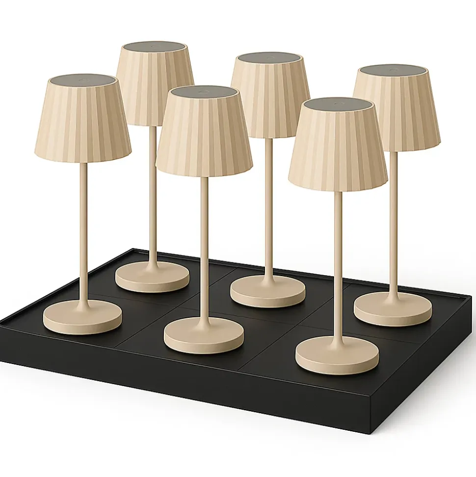 Optimisez l’éclairage de vos tables avec ce lot de 6 lampes sans fil Abby Cream, accompagné de son plateau de chargement multiple. Chaque lampe LED en aluminium beige crème offre un design fin et sophistiqué, avec un abat-jour de 11 cm de diamètre et une hauteur totale de 29 cm. Le plateau de charge par contact inclus permet de recharger les 6 unités simultanément sans aucun câble gênant, garantissant une gestion simplifiée et efficace de votre parc lumineux. Grâce au variateur d’intensité blanc chaud tactile, vous pouvez ajuster le flux puissant de 230 lumens pour créer l’ambiance parfaite sur chaque table en pressant simplement le bouton on/off. Certifiées IP65, ces lampes sont totalement étanches aux éclaboussures et aux poussières, ce qui les rend idéales pour un usage professionnel intensif en terrasse de restaurant ou au jardin. Ce pack nomade et robuste valorise votre décoration tout en offrant une autonomie de 7 heures pour sublimer vos soirées.