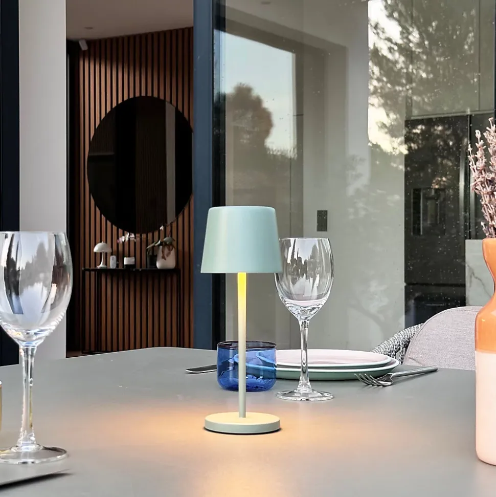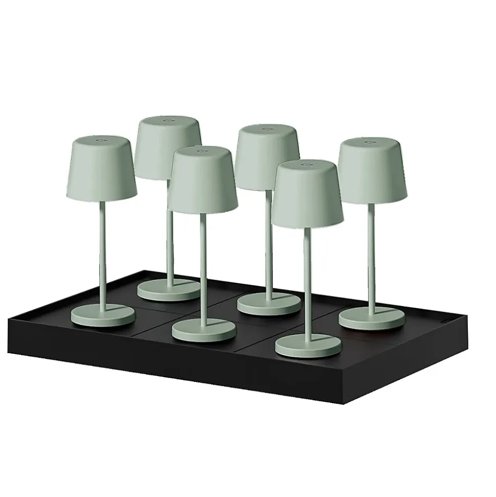 Ce lot de 6 mini lampes de table sans fil Kelly Mini Olive avec plateau de chargement multiple est la solution d’éclairage idéale pour vos tables de restaurant ou vos receptions. Chaque mini lampe LED en aluminium vert olive offre une silhouette compacte de 22 cm de haut et 8, 2 cm de large alliant design naturel et solidite. Le plateau de charge par contact inclus permet de recharger les 6 unités simultanement en seulement 2 heures offrant ainsi 7 heures d’autonomie sans aucun câble genant sur vos tables. Chaque lampe dispose d’un variateur d’intensite blanc chaud de 186 lumens permettant de créer une ambiance chaleureuse et personnalisee pour vos convives. Certifiees IP54 et résistantes aux UV elles sont conçues pour un usage intensif en extérieur comme en intérieur valorisant instantanement votre décoration de table avec style et modernite.