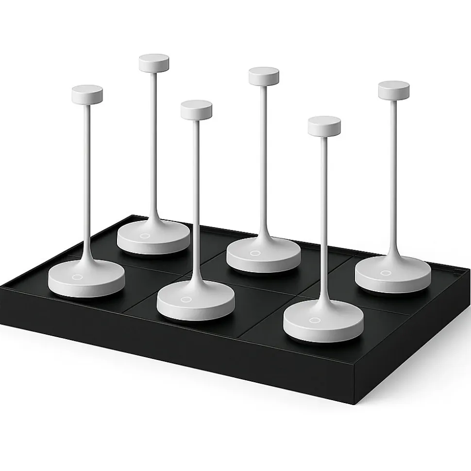 Optimisez l’éclairage de vos tables avec ce lot de 6 lampes sans fil Ruby White, accompagné de son plateau de chargement multiple. Chaque lampe LED en aluminium blanc offre un design fin et épuré, avec un abat-jour de 7, 5 cm de diamètre et une hauteur totale de 25 cm. Le plateau de charge par contact inclus permet de recharger les 6 unités simultanément sans aucun câble apparent, garantissant une autonomie de 8 heures après une charge de 3 heures. Grâce au variateur d’intensité blanc chaud réglable sur 4 positions, vous pouvez ajuster le flux de 150 lumens selon l’ambiance souhaitée sur chaque table. Certifiées IP65, ces lampes résistent parfaitement aux éclaboussures et aux poussières, ce qui les rend idéales pour un usage professionnel intensif en terrasse de restaurant ou lors d’événements festifs. Ce pack nomade et robuste valorise votre décoration tout en simplifiant la gestion de votre éclairage au quotidien avec une technologie sans fil discrète et chic.