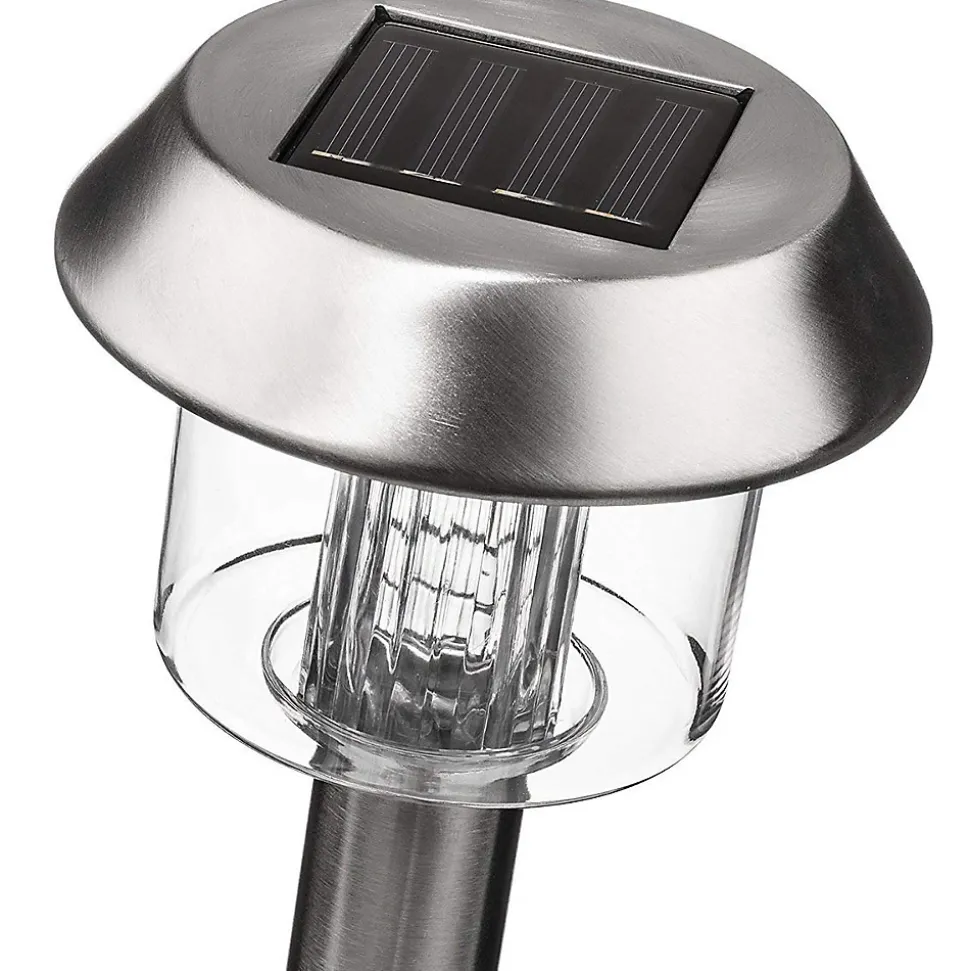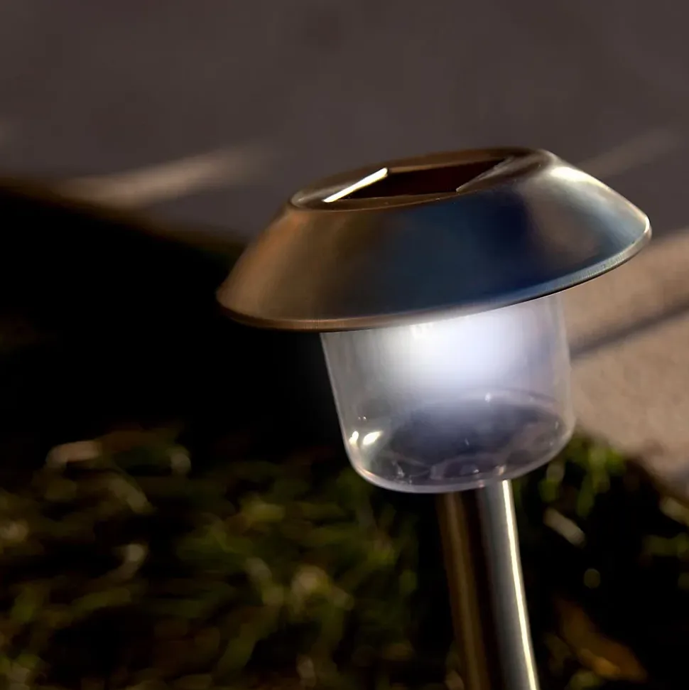 Lot de 8 balises solaires LED blanc froid ALESIA, H39 cm, structure métal noir, 1 W par balise, flux 5 lm, autonomie jusqu’à 8 h après 4-6 h de charge, IP44, résistantes aux UV, garanties 2 ans.