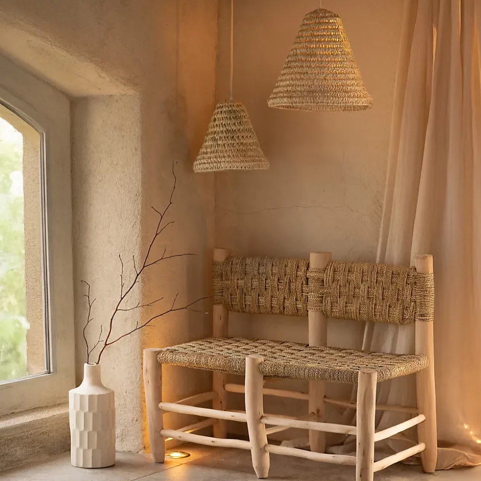 Abat-jour cône feuilles de palmier Apportez une touche naturelle et élégante à votre intérieur avec cet abat-jour en osier, inspiré des feuilles de palmier. Son tressage artisanal diffuse une lumière douce et chaleureuse, parfaite pour créer une ambiance bohème et apaisante dans n’importe quelle pièce. Caractéristiques : Matériau naturel : conçu en osier, il offre un rendu authentique et chaleureux. Design inspiré des feuilles de palmier : un tressage délicat qui apporte une touche exotique et raffinée. Deux dimensions disponibles : 30×30 cm : idéal pour une lampe de chevet ou une petite suspension. 40×50 cm : parfait pour un éclairage principal ou un lampadaire. Ambiance tamisée : laisse passer une lumière douce et naturelle pour une atmosphère cosy. Style polyvalent : s’intègre parfaitement dans un décor bohème, tropical ou scandinave. Cet abat-jour en osier est un choix idéal pour sublimer votre intérieur avec une note authentique et chaleureuse.