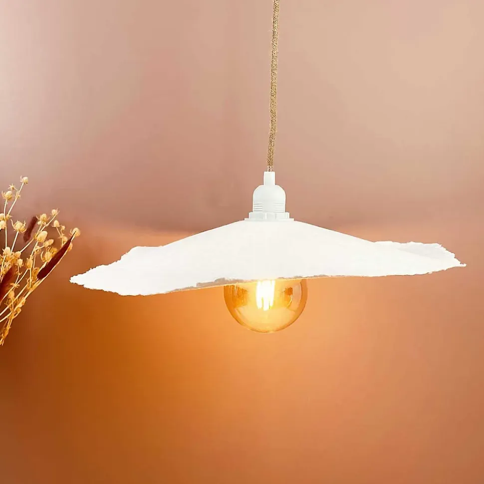 Abat jour ou suspension en papier mâché Louise coloris blanc D44cm – Opjet Paris Ce superbe abat jour en papier mâché est poétique grâce à sa forme de fleur asymétrique et sa matière qui laisse passer délicatement la lumière. Ce luminaire est fait à la main, les dimensions peuvent donc varier légèrement. Ce luminaire est livré seul ou avec sa monture blanche et cordon naturel, un support cercle avec montage E27 est prévu pour accueillir la douille de la monture. L’association est parfaite avec la monture blanche et cordon naturel proposée en option. Version de base livrée sans monture (douille + cordon) : Abat-jour seul. Pack avec monture électrique en vente sur le site Mybohem.fr Découvrez le reste de la gamme suspension >> toutes nos suspensions en papier maché