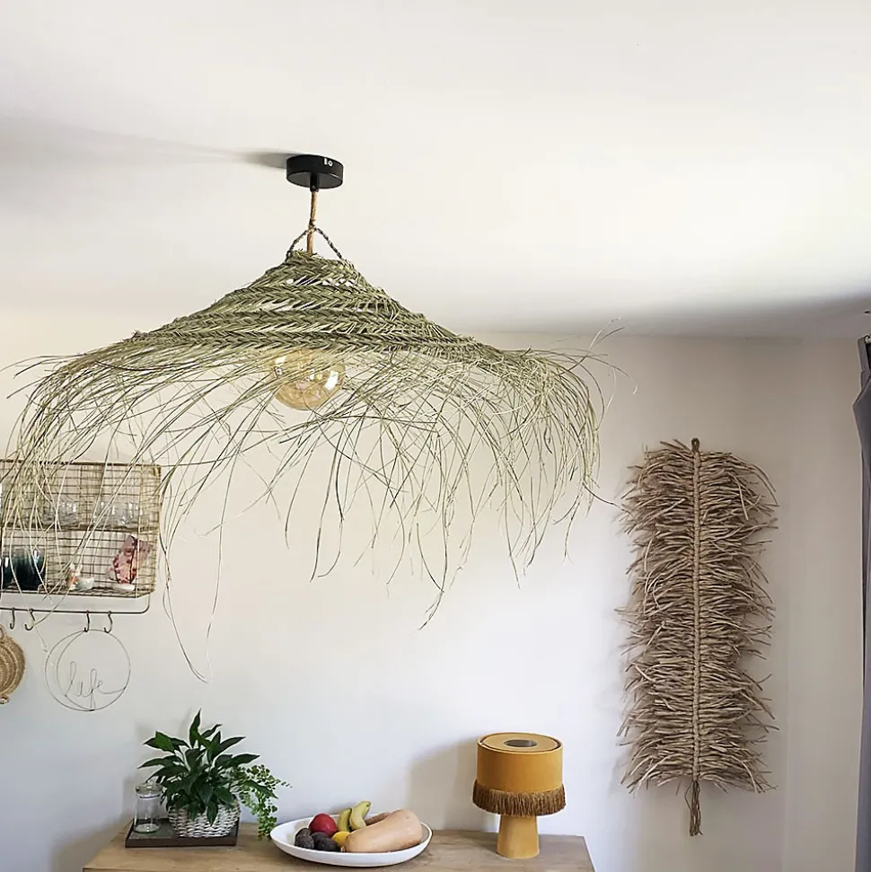 Abat-jour ajouré en paille naturelle forme parasol – Fibres alfa Nous avons sélectionné cette suspension marocaine que nous proposions déjà mais cette fois-ci dans un nouveau diamètre : 60 cm. Nous ne pouvions pas laisser de côté ce modèle vu le cachet qu’il apporte dans une pièce. A positionner en suspension, apportez à votre intérieur une déco ethnique chic et bohème. Cette forme parasol déjà proposée faisant l’unanimité, la voici dans sa nouvelle taille 60 cm pour s’adapter à toutes les pièces ! Dans une ambiance très tendance et naturelle « bord de plage » grâce à sa paille alfa. Ce modèle est plus rigide que la grande version Taille L 70 cm, il ne s’ondulera pas autant et gardera plus sa forme à plat. Les franges en paille de tressage en fibre naturelle de palmier donnent un aspect naturel et irrégulier très bohème. Chaque pièce est unique, la dimension peut donc varier très légèrement. Diamètre sans franges 55-60 cm et diamètre avec franges : 70-75cm env. Hauteur : 20 – 25 cm (avec anse corde) Leur utilisation en intérieur est idéale, prévoir une monture avec une ampoule LED ou un petit crochet au plafond. Ces luminaires se positionnent aussi en extérieur avec une installation électrique adaptée et étanche, car la paille résiste sans problème à l’eau. Ce luminaire est vendu sans monture électrique (cordon + douille) il est léger et peut se suspendre très facilement. Retrouvez nos autres luminaires « naturels » issus de l’Artisanat marocain par ici >> Lampe paille Maroc