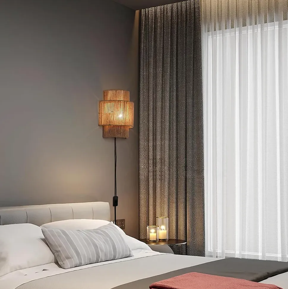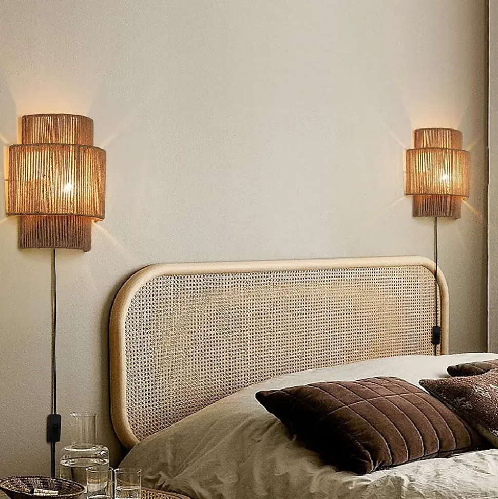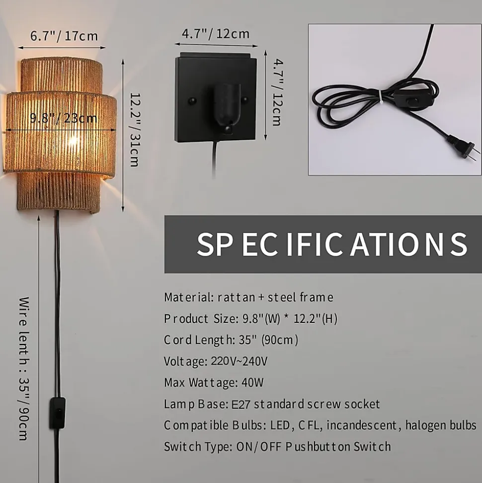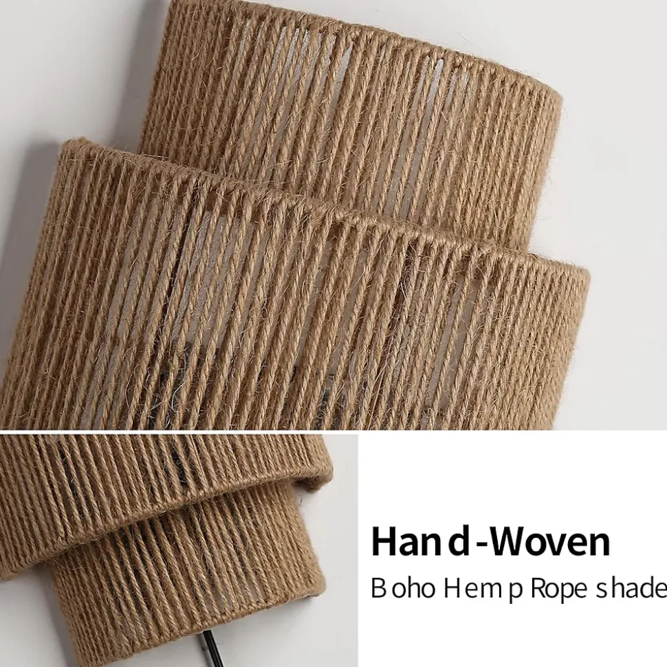 Applique murale bohème en corde de chanvre avec prise – E27Design artisanal et chaleureux :Cette élégante applique murale est fabriquée à la main avec de la corde de chanvre naturelle et une structure métallique, apportant un charme rustique et bohème à tout intérieur. Son design à double cylindre permet à la lumière de se diffuser doucement entre les fibres, créant une atmosphère chaleureuse et relaxante. Parfaite pour les chambres, salons ou coins lecture, elle s’accorde facilement avec les styles boho, modernes ou rustiques contemporains.Éclairage décoratif :Grâce à son abat-jour ouvert en haut et en bas, l’applique projette une lumière ambiante douce avec un magnifique motif sur le mur. Idéale pour créer une atmosphère intime et naturelle dans n’importe quel espace.Installation simple avec prise :Aucune installation électrique murale n’est nécessaire.Comprend un câble avec prise de 90 cm et un interrupteur intégré, ce qui permet de la placer facilement près d’une prise de courant et de l’allumer en toute simplicité. Vous pouvez installer une ou plusieurs unités pour un effet décoratif équilibré.Caractéristiques du produit :Matériaux : corde de chanvre tressée à la main, rotin naturel et structure métalliqueDimensions : 31 × 23 × 9 cmLongueur du câble : 90 cmType de douille : E27Tension : 220–240 VPuissance maximale : 40 W (ampoule non incluse)Ampoule recommandée :Compatible avec les ampoules LED, incandescentes ou à économie d’énergie. Ampoules Edison ambrées recommandées pour un éclairage chaud et décoratif.