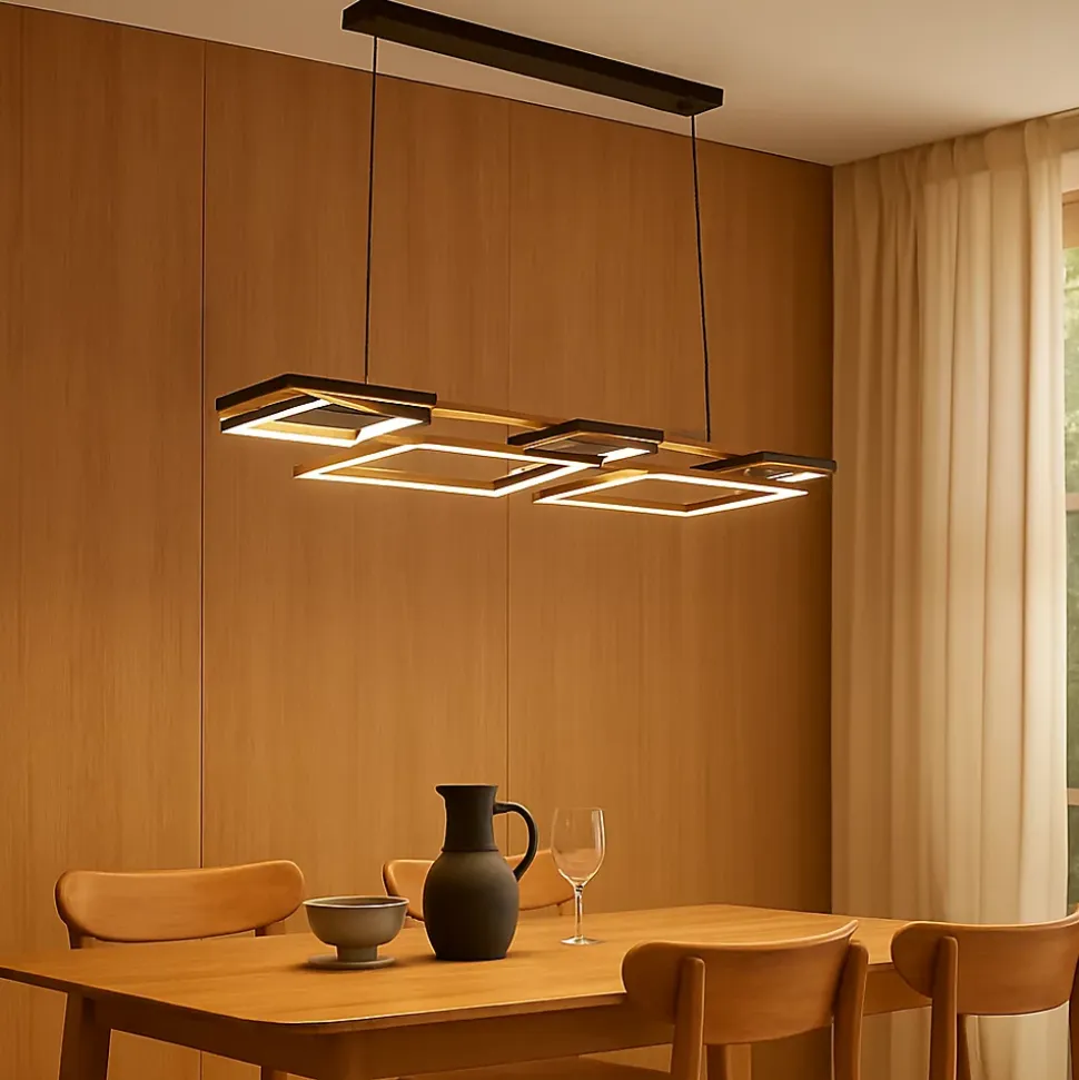 La suspension Lucienne associe un design contemporain, une chaleur naturelle et une technologie avancée. Sa structure innovante à deux niveaux se compose de trois cadres carrés orientés vers l’intérieur en partie supérieure qui diffusent une lumière d’ambiance douce, et de deux cadres rectangulaires inférieurs qui projettent une lumière directe vers le bas, offrant un éclairage homogène et fonctionnel. Idéale au-dessus d’un îlot de cuisine, d’une table à manger ou d’un espace de travail.Le corps est fabriqué en et métal avec finition naturelle, tandis que les structures LED en aluminium et silicone assurent une grande durabilité et une excellente dissipation thermique.Grâce à la télécommande incluse, vous pouvez ajuster l’intensité lumineuse ainsi que la température de couleur (2700K – chaud, 4000K – neutre, 6500K – froid), pour créer l’ambiance parfaite à tout moment. Elle est également compatible avec les plafonds inclinés et dotée de câbles réglables en hauteur, ce qui la rend adaptée à tous les types d’intérieurs.Caractéristiques principales :Design moderne à deux niveaux avec 5 LED intégréesNiveau supérieur : 3 cadres carrés orientés vers l’intérieur (lumière d’ambiance)Niveau inférieur : 2 cadres rectangulaires (éclairage direct vers le bas)Matériaux : MDF et métal, structures LED en aluminium et siliconeIntensité lumineuse réglable (dimmable)Température de couleur réglable : 2700K / 4000K / 6500KPuissance totale : 60W – flux lumineux jusqu’à 4200 lmCRI > 80Compatible avec plafonds inclinésCâble réglable jusqu’à 200 cmLED intégrées – pas besoin d’ampoulesTélécommande incluse (piles non fournies)Certifications : ETL/ULDimensions :Pavillon : 96 × 12 × 4 cmStructure totale : 121 × 31 × 7 cmCadres carrés : 20 × 20 × 2 cmCadres rectangulaires : 41 × 31 × 2 cmPanneaux en bois : 121 × 11 × 2 cmLongueur de câble : jusqu’à 120 cmHauteur maximale : 131 cm