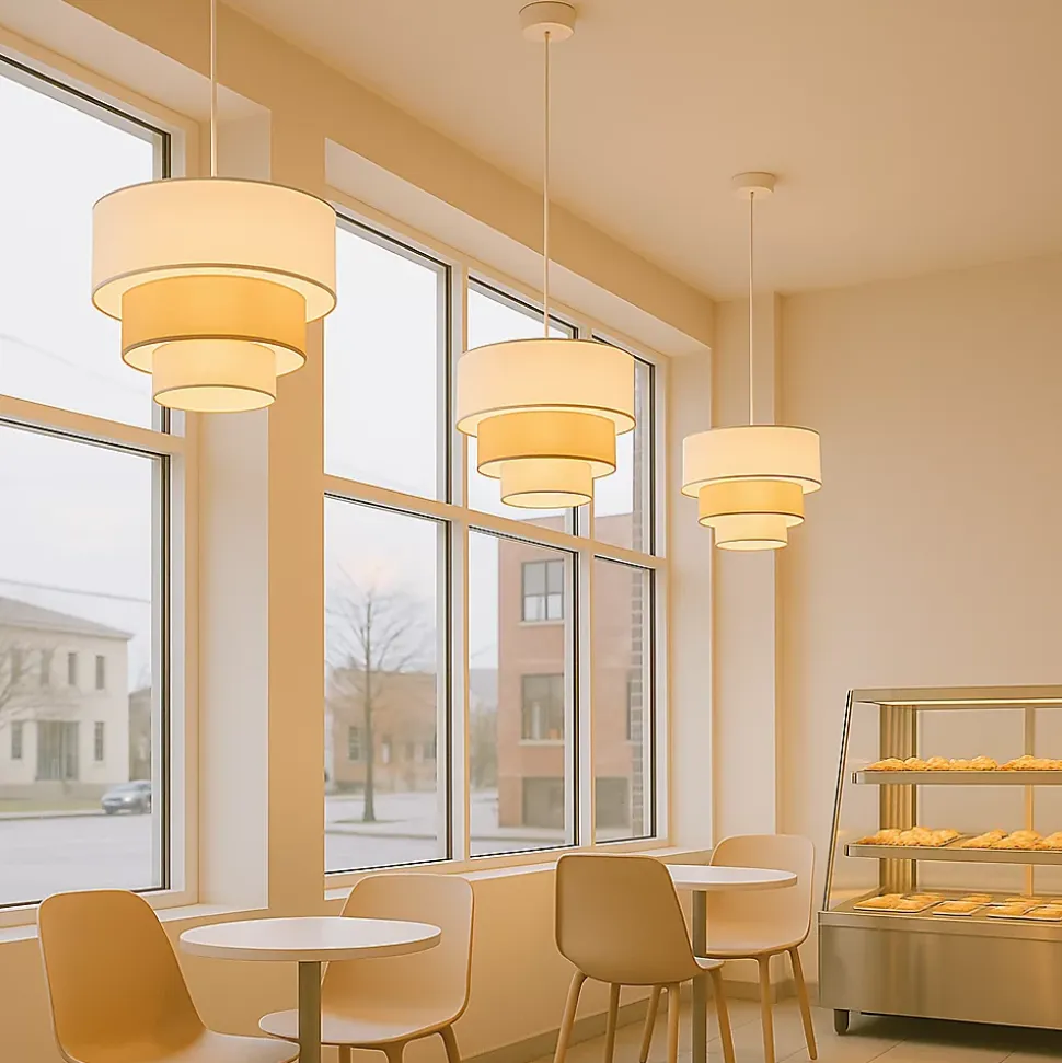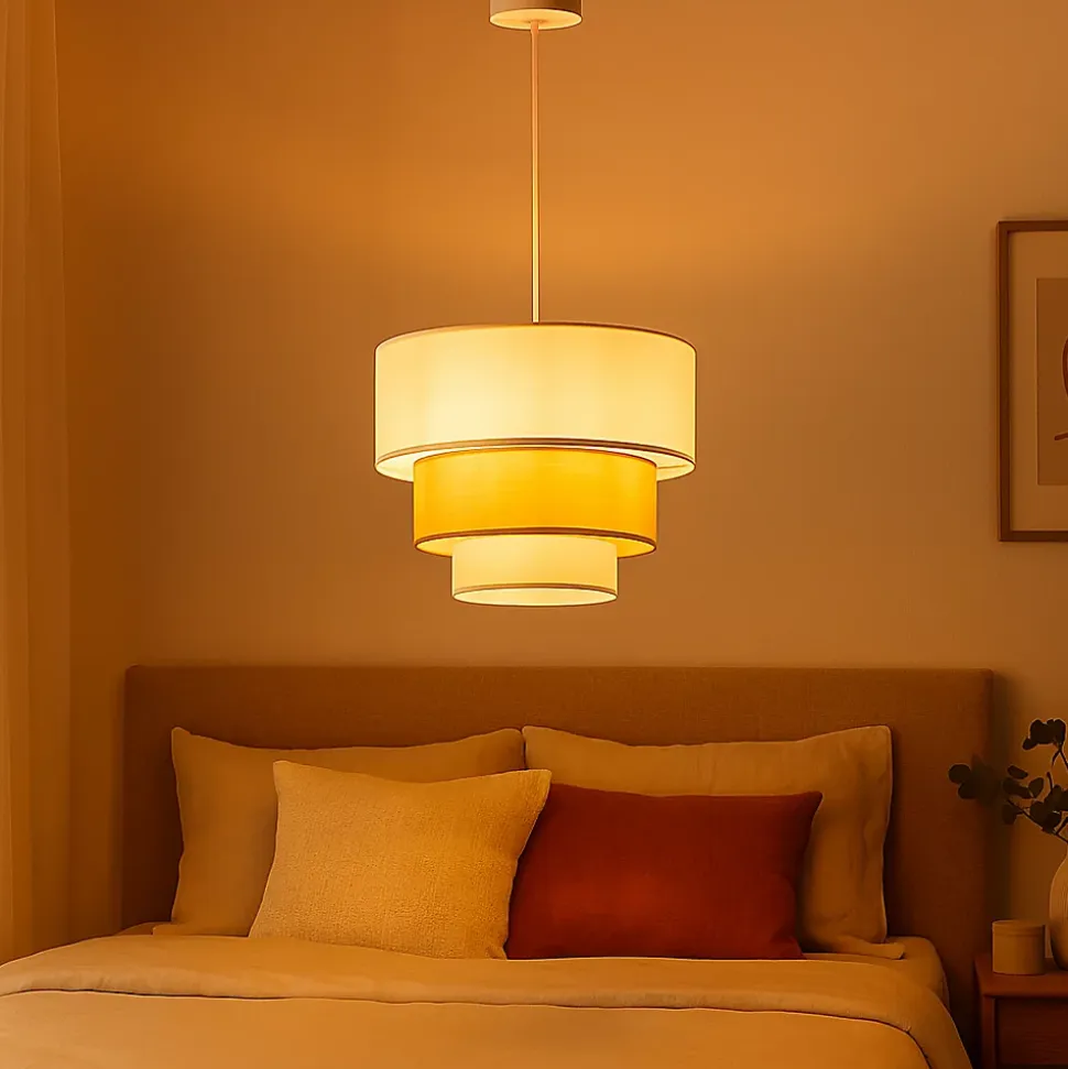 Suspension Textile “NIVELA” – Trois Niveaux, Ø38–40 cm x 30 cm, Douille E27La suspension “NIVELA” se distingue par son design textile à trois niveaux superposés, créant un effet visuel élégant, moderne et harmonieux. Parfaite pour les chambres, salons, couloirs, salles à manger et espaces de passage, elle apporte une atmosphère chaleureuse et décorative.Fabriquée en textile de haute qualité, elle diffuse la lumière de manière douce et uniforme. Compatible avec une ampoule E27 (LED ou standard), elle permet d’adapter la luminosité selon vos besoins.Disponible en plusieurs couleurs :Blanc, Jaune, Beige, Violet, Bleu, Vert, Marron.Dimensions : Ø38–40 cm de largeur et 30 cm de hauteur.Caractéristiques PrincipalesAbat-jour textile à trois niveaux, design moderne et décoratif.7 couleurs disponibles pour s’adapter à tout intérieur.Compatible ampoule E27 (non incluse).Lumière homogène et agréable.Idéale pour chambres, salons et couloirs.Dimensions : Ø38–40 cm × 30 cm.Légère, élégante et facile à installer.