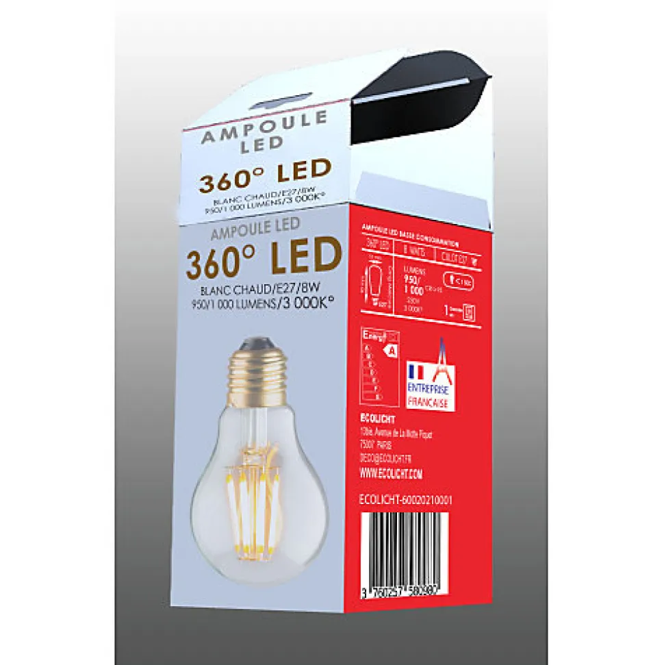 Ping vous propose :Cette ampoule LED A60 E27 de style classique. Pour donner un côté vintage ou industriel à votre déco intérieur, rien de mieux que cette ampoule en verre transparente en forme de bulbe, laissant apparaître les filaments lumineux de LEDs effilés droits. Cette ampoule se caractérise par son éclairage puissant et uniforme, sa longévité dans le temps et sa très faible consommation énergétique. Une lumière blanche chaude de 3000 K, lumière ambiante pour n’importe quel espace. Sa mise en place est aussi simple que les ampoules standards à incandescence car cette ampoule à LED est munie d’un culot E27 (vissable) et nul besoin d’abat-jour.Composée de LEDs protégées par le verre clair qui l’englobe, cette ampoule vous offrira une éclairage radial à 360°.Les plus du produit :- Economie énergétique- Nul besoin d’abat-jour- Eclairage radiant 360°- longévité dans le tempsCaractéristiques :Marque: EcolichtType : A60Libéllé 1 : A60 CLASSICCulot : E27LED : DroitsPuissance : 8WLumens : 950/1.000 Lm<s