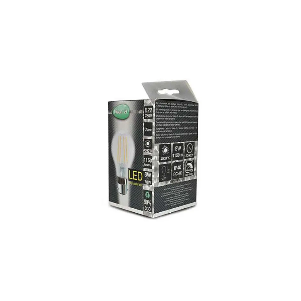 Ampoule LED de type filament COB d’une puissance de 8W. Culot B22, éclairage équivalent à 80W. Très discrète cette ampoule est similaire par son design à une ampoule à incandescence. Éclairage immédiat, marque Vision-EL. Forme A60, Ø60 mm x 107 mm. 2700K 8W 80W 1150lm 300°