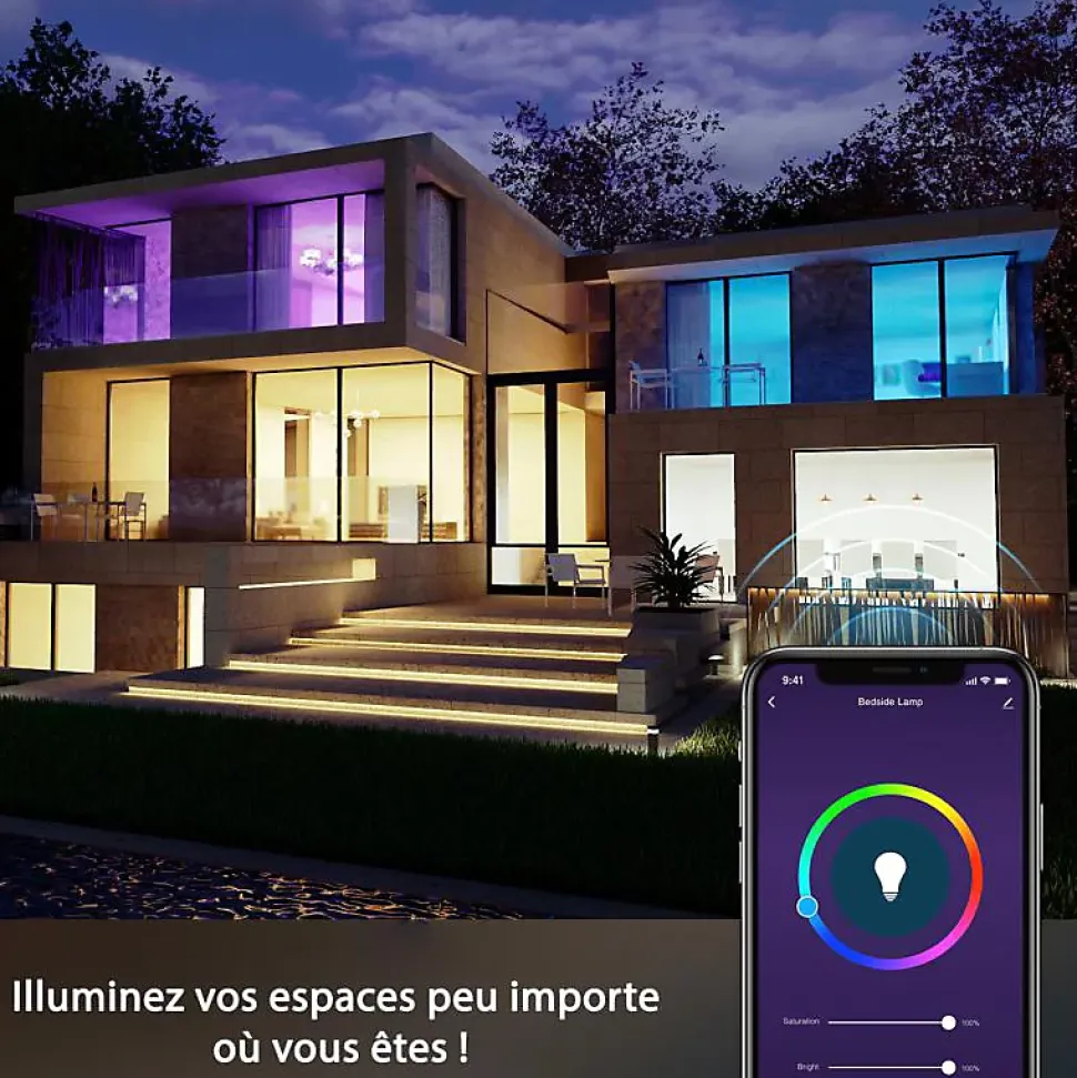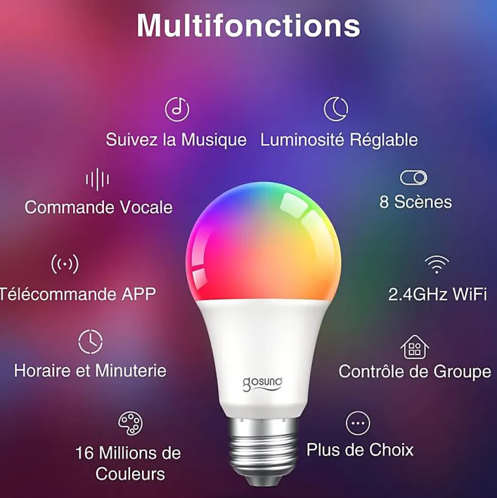 FACILE À INSTALLERPour connecter votre ampoule, suivez pas à pas la notice explicative que vous trouverez dans notre guide utile. Une fois l’appairage effectué, vous serez en mesure de gérer votre éclairage à distance. Pour cela, il vous suffit simplement de télécharger l’application gratuite Gosund ou Tuya, disponible sur iOS et Android. UNE PERSONNALISATION SANS LIMITESCetteAmpoule LED Connectée B22 8W WiFi RGBWvous permet d’éclairer aisément vos pièces à vivre tout en créant une ambiance selon vos besoins grâce à son système RGBW. Depuis l’application gratuite Gosund ou Tuya, cette ampoule vous propose différentes fonctionnalités : gérer plusieurs ampoules simultanément via le contrôle groupé, choisir la couleur que vous souhaitez parmi une très large palette de couleurs (16 millions), régler l’intensité lumineuse de votre ampoule, ou encore programmer quand vous souhaitez qu’elle fonctionne. Il est également possible de réaliser des jeux de lumière une fois la musique allumée ! UNE TECHNOLOGIE INNOVANTEConçue pour durer et résister à l’usure, l’Ampoule LED Connectée B22 8W WiFi RGBWviendra parfaire votre décoration ambiante. Elle vous accompagnera lors de vos soirées notamment lorsque vous activerez le mode > qui vous permettra de donner du dynamisme à votre éclairage. Grâce à sa technologie innovante, vo