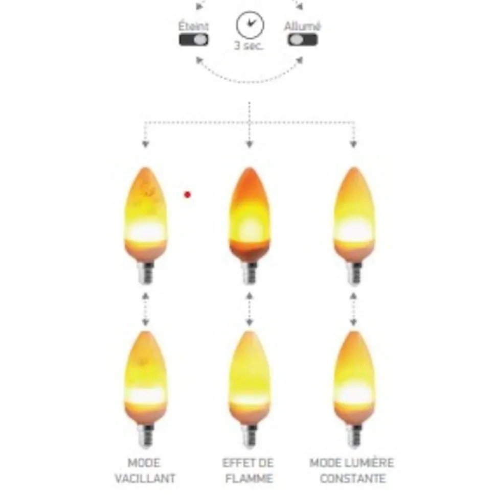 Les caractéristiques techniquesCette ampoule Led de forme flamme est en plastique avec un culot E14.Elle diffuse une agréable lumière blanc très chaud. Elle vous propose 3 modes de fonctionnement : effet statique, effet flamme et effet scintillant par simple appui sur un interrupteur classique.Sa durée de vie de 25.000 heures et la qualité des matériaux permettent de la garantir 3 ans.Passer à la Led vous offrira de nombreux avantages dont une faible consommation d’énergie (cette ampoule 5W correspond à une ampoule traditionnelle de 50W) et une durée de vie plus importante (elle fonctionne 25000 heures contre 1000 heures pour une ampoule traditionnelle).Elle ne produit pas de scintillement fatigant pour les yeux ni de radiation UV et ne contient pas de mercure.Contrairement à vos anciennes ampoules basse consommation, cette Ampoule Led permet un éclairage à pleine puissance immédiat.Les avantages esthétiquesLa forme flamme de cette ampoule convient particulièrement pour remplacer vos anciennes ampoules dans des lampes de style baroque ou candélabre. Son faible niveau d’éclairement (60 lumens) et sa température de couleur blanc très chaud en font plutôt une ampoule destinée à une lampe d’ambiance.Cette caractéristique est renforcée par les 3 effets lumineux qui vous permettront de créer des atmosphères différentes.
