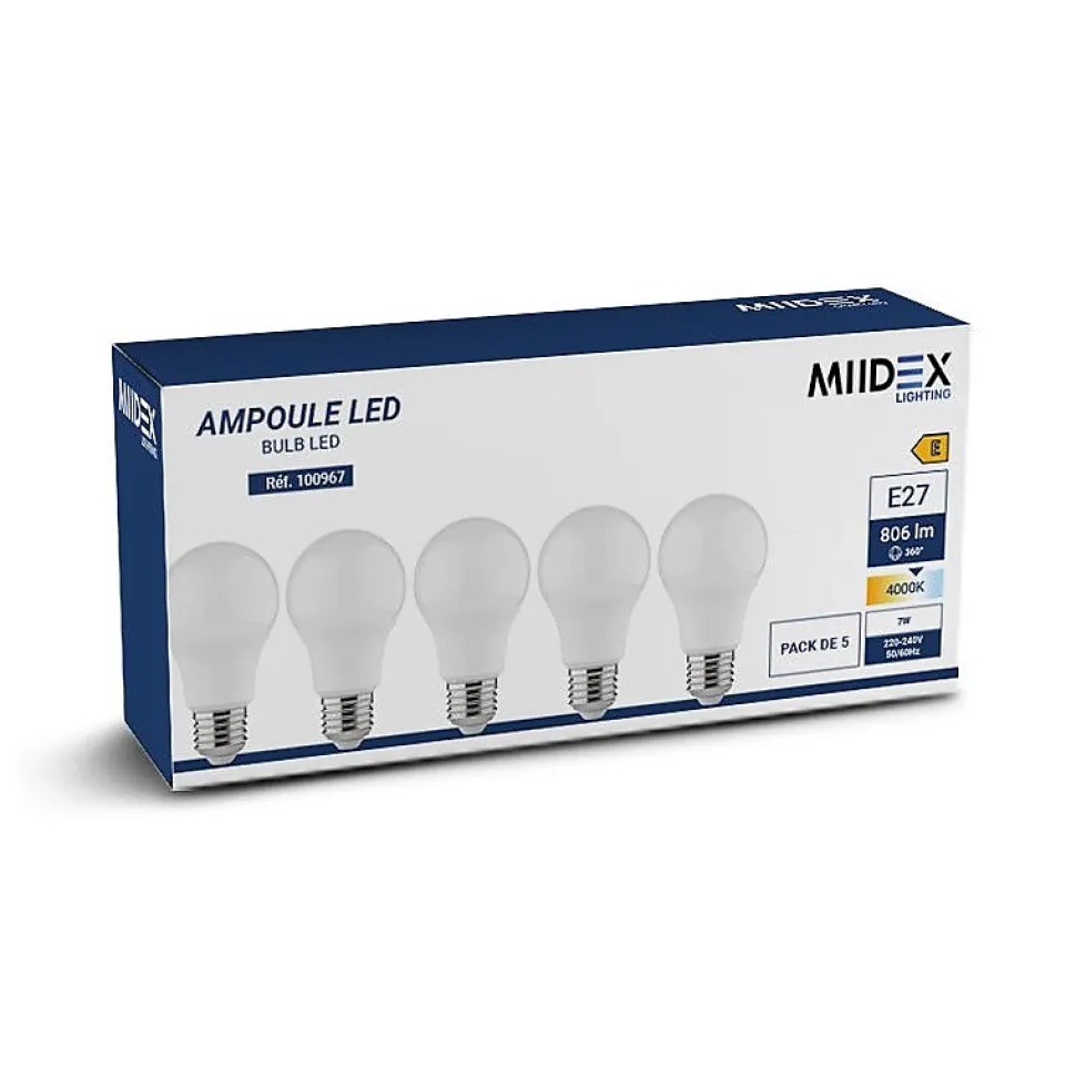 Ampoule LED E27 7W – Blanc Neutre 4000K – 180° – Pack de 5