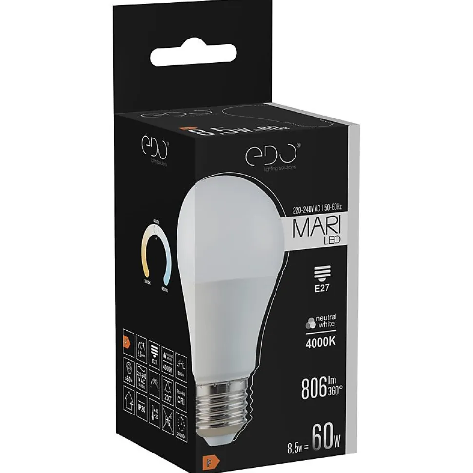 MARI Ampoule LED E27 8.5W 4000K neutre NW 806lm EDO777433Les lampes MARI ont une efficacité énergétique élevée ce qui en fait un choix rentable garantissant une longue durée de vie avec une consommation d’énergie minimale. Grâce à la technologie LED de pointe elles génèrent une forte intensité lumineuse qui disperse la lumière de manière uniforme éliminant les ombres et assurant le confort des yeux. ✅ SPÉCIFICATIONS TECHNIQUES :✔️ Puissance : 8.5W✔️ Flux lumineux : 806lm✔️ Couleur de la lumière : 4000K✔️ Classe énergétique : F✔️ Angle lumineux : 200°✔️ Durée de vie : 20000h✔️ Alimentation : 220V-240V✔️ Forme de l’ampoule : traditionnelle✔️ Couleur de la bulle : mat
