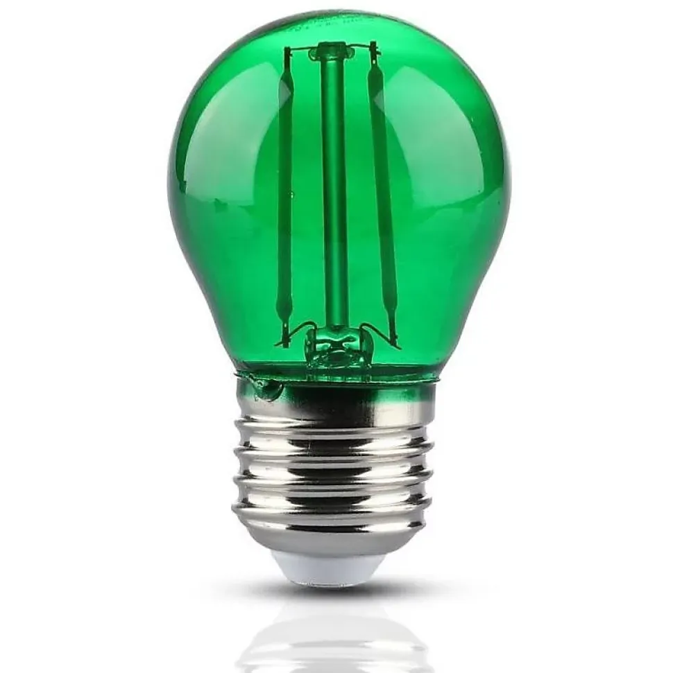 [Ampoule LED E27 Filament 2W G45 Vert] Commandez l’Ampoule LED E27 Filament 2W G45 Vert pour éclairer votre pièce d’une lumière verte agréable et douce. L’ampoule E27 verte est un réel atout pour vos jours de fêtes, que ce soit pour décorer un anniversaire ou durant les fêtes de fin d’année, cette ampoule filament saura répondre à vos besoins.[Éclairage et luminosité] L’ampoule E27 ne demande qu’une faible puissance de 2W pour s’allumer et produire un flux lumineux de 60 lumens. Son angle d’éclairage est immense puisqu’elle diffuse sa lumière de façon homogène sur un faisceau lumineux de 300°. [Une ampoule décorative] L’ampoule LED possède une couleur de lumière verte, très appréciée durant les festivités. De par son design et son globe de 45mm, elle décore délicatement votre pièce.[Utilisation] L’ampoule LED filament est parfaite pour votre salon, votre chambre ou pour votre séjour. Elle possède un indice de protection IP20, qui signifie qu’elle ne doit pas être exposée à l’humidité. Insérez l’ampoule LED dans votre guirlande guinguette E27 ou dans votre suspension ampoule LED. Le rendu sera parfait![La qualité Silamp] Silamp s’engage pour vous fournir des produits de qualité et garantis 2 ans, ainsi qu’un service client à l’écoute et réactif.- [Ampoule LED E27 Filament 2W G45 Vert] Commandez l’Ampoule LED E27 Filament 2W G45 Vert pour éclairer votre pièce d’une lumière verte agréable et douce. L’ampoule E27 verte est un réel atout pour vos jours de fêtes, que ce soit pour décorer un anniversaire ou durant les fêtes de fin d’année, cette ampoule filament saura répondre à vos besoins.