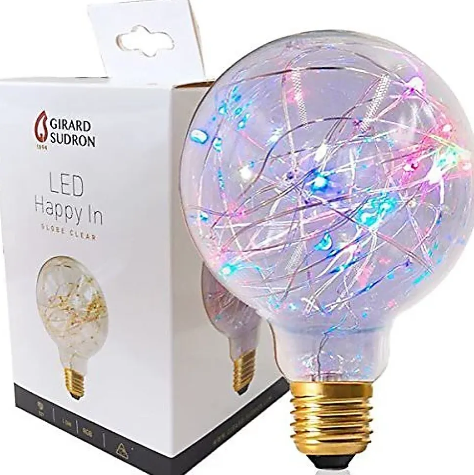 Les caractéristiques techniquesCette ampoule Led géante à filament se présente sous la forme d’un globe en verre transparent. L’intérieur est rempli d’un filament doré équipé de LED vertes, rouges et bleues clignotantes.Vous pouvez installer cette ampoule sur toute lampe à culot E27.Sa faible consommation (1,5 watts) et sa longévité (25000 heures) en font un investissement rentable.Les avantages esthétiquesRetrouvez votre âme d’enfant avec cette superbe ampoule à effet de mouvement scintillant.Cette ampoule festive illuminera vos événements festifs : anniversaires, fêtes de fin d’année.Pour un usage professionnel, l’ampoule festive constituera une décoration raffinée et attrayante de votre vitrine.Cette ampoule festive existe également en petit modèle (9,5 cm) : ref 16027