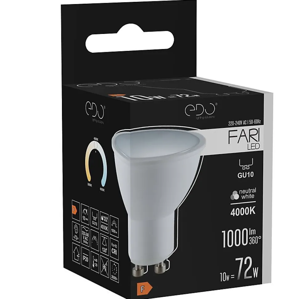 Ampoule LED FARI GU10 10W 4000K neutre 1000lm 120° Edo SolutionsAmpoule FARI LED GU10 10W 4000K neutre 1000lm. Technologie LED moderne et look classique. Offre des économies d’énergie et une longue durée de vie. Idéale pour toutes les pièces de la maison ou du bureau.Dimensions [mm] : ✔️diamètre : ø50 mm✔️hauteur : 50 mmDONNÉES GÉNÉRALES:✔️Type de source : LED ✔️Culot : GU10✔️Couleur de la lentille : mat✔️Forme de l’ampoule : réflecteur✔️Classe d’efficacité énergétique [A-G] : F✔️Compatibilité avec un variateur : non✔️Puissance en mode marche Pon [W] : 10W✔️Puissance en mode veille Psb/Pnet [W] : -✔️Tension nominale [V] : 220-240 V AC✔️Fréquence nominale [Hz] : 50-60 Hz✔️Couleur de la lumière : blanc neutre✔️Température de couleur [K] : 4000K✔️Changement de couleur de la lumière : non✔️Indice de rendu des couleurs CRI : 80✔️Indice de rendu des couleurs R9 : 9✔️Flux lumineux utile [lm] : 1000 lm✔️Mesure du flux lumineux dans : sphère (360°)✔️Efficacité lumineuse [lm/W] : 100 lm/W✔️Angle de diffusion de la lumière [°] : 120°✔️Durée de vie nominale [h] : 20000h✔️Nombre de cycles marche/arrêt : 15000✔️Consommation d’énergie en mode marche [kWh/1000h] : 10kWh/1000h✔️Déclaration d’équivalence de puissance [W] : 72W
