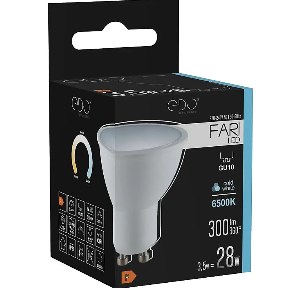 Ampoule LED FARI LED GU10 3.5W 6500K froid 300lm 120° Edo SolutionsAmpoule FARI LED GU10 3,5W 6500K froid 300lm. Technologie LED moderne et look classique. Offre des économies d’énergie et une longue durée de vie. Idéale pour toutes les pièces de la maison ou du bureau.Dimensions [mm] : ✔️diamètre : 50 mm✔️hauteur : 56 mDONNÉES GÉNÉRALES :✔️Type de source : LED ✔️Culot : GU10✔️Couleur de la lentille : mat✔️Forme de l’ampoule : réflecteur✔️Classe d’efficacité énergétique [A-G] : F✔️Compatibilité avec un variateur : non✔️Puissance en mode marche Pon [W] : 3,5 W✔️Puissance en mode veille Psb/Pnet [W] : -✔️Tension nominale [V] : 220-240 V CA✔️Fréquence nominale [Hz] : 50-60 Hz✔️Couleur de la lumière : blanc froid✔️Température de couleur [K] : 6500K✔️Changement de couleur de la lumière : non✔️Indice de rendu des couleurs CRI : 80✔️Indice de rendu des couleurs R9 : 14✔️Flux lumineux utile [lm] : 300 lm✔️Mesure du flux lumineux dans : sphère (360°)✔️Efficacité lumineuse [lm/W] : 85,71 lm/W✔️Angle de diffusion de la lumière [°] : 120°✔️Durée de vie nominale [h] : 20000h✔️Nombre de cycles marche/arrêt : 15000