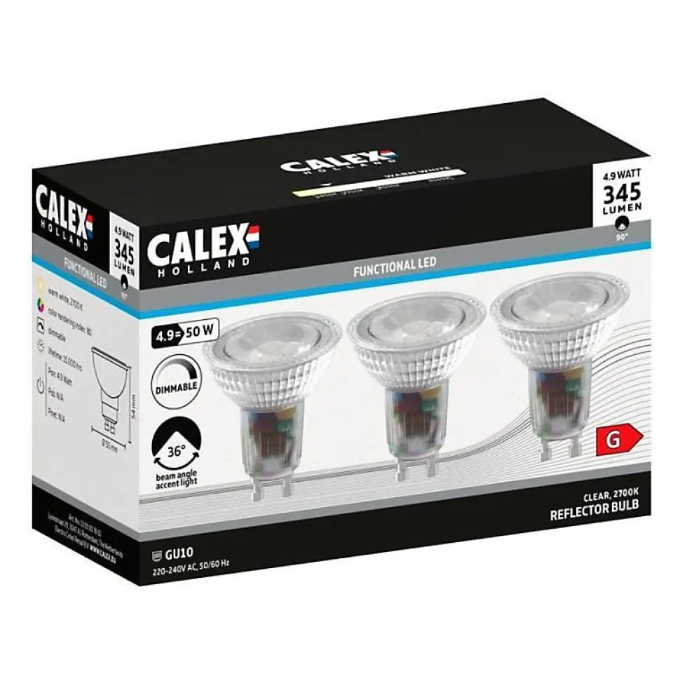 Ampoule réflecteur LED GU10 Calex 4,9 W (équiv. 50 W) — 345 lm, lumière blanc chaud 2700 K, dimmable, faisceau 36°, finition chrome avec réflecteur prismatique, durée de vie estimée 15 000 h, pour 220–240 V.