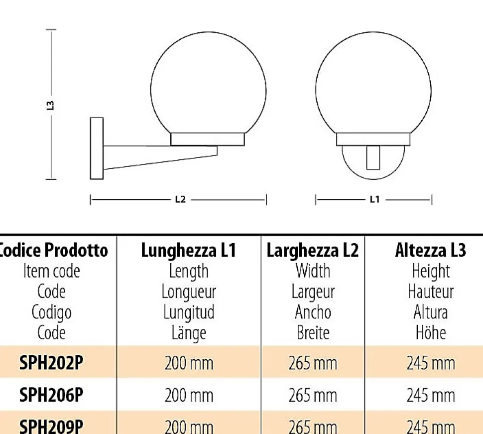 Applique murale extérieure IP44, avec sphère diamètre 200 mm. Compatible avec les ampoules LED jusqu’à 40W; Connexion E27; ampoule non incluse; Diffusion à 360 °. Matériel: PMMA; Le PMMA est un polymère hyper-résistant qui résiste aux chocs et au passage du temps. Se connecte directement au secteur.