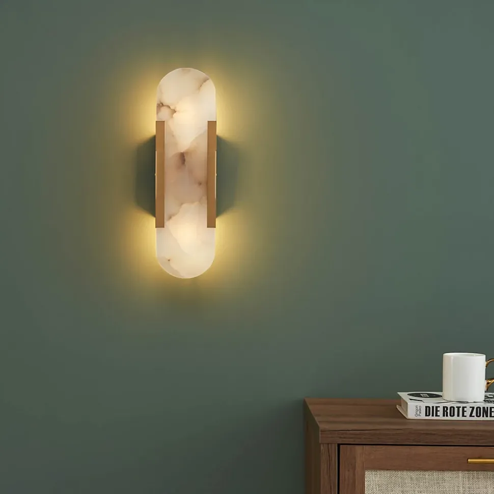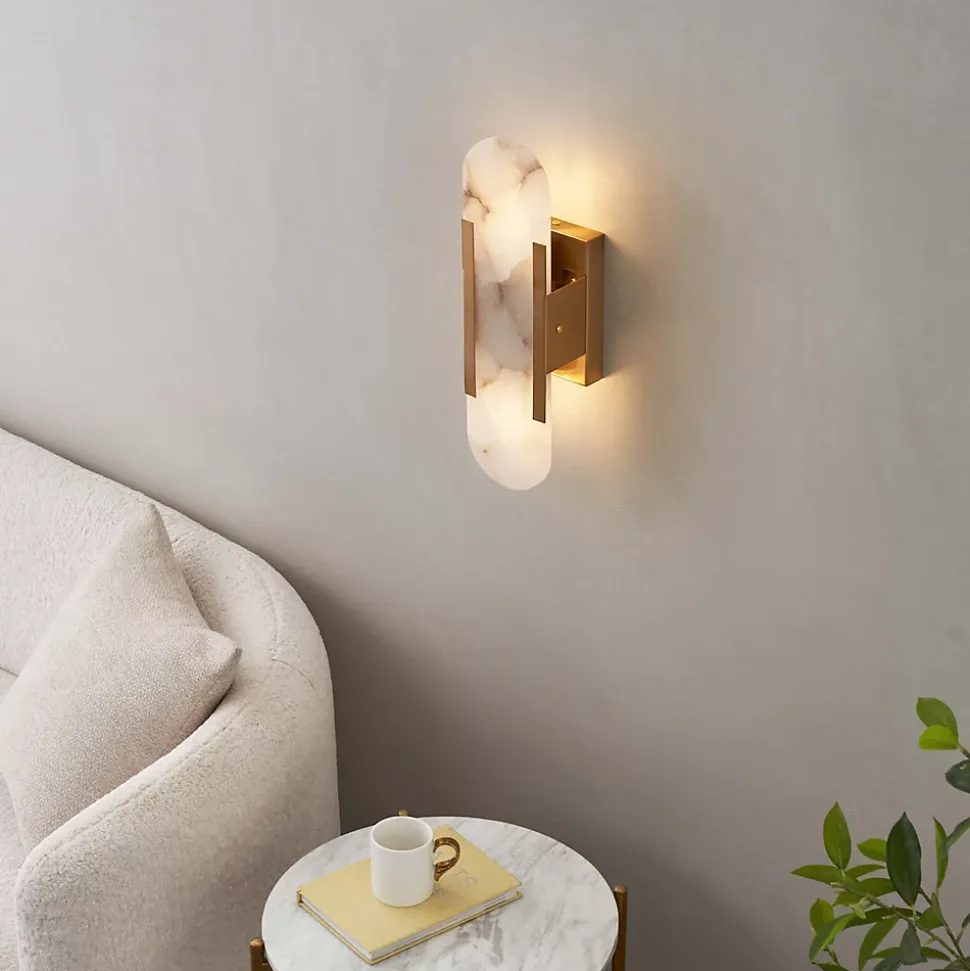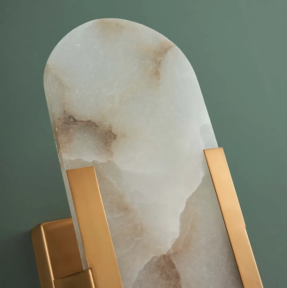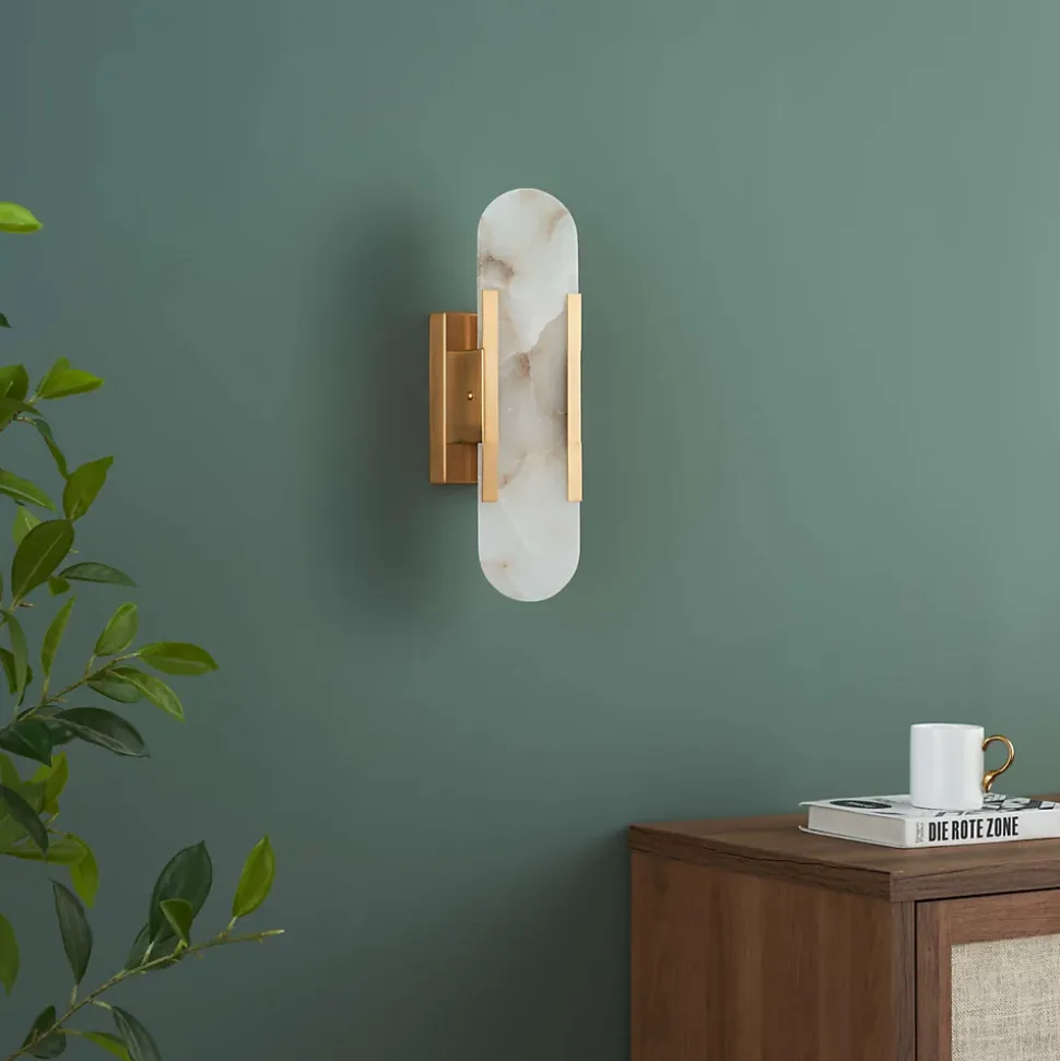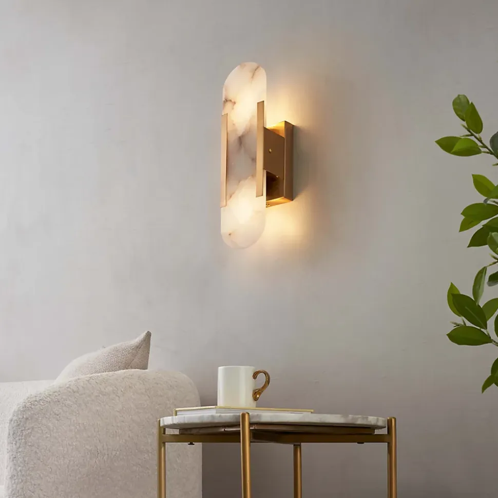 L’applique Enola se distingue par son association de métal doré raffiné et d’albâtre blanc marbré délicat, pour une esthétique chic et sophistiquée. Elle diffuse une lumière douce et harmonieuse à travers l’albâtre, instaurant une atmosphère chaleureuse dans votre espace. Cette applique doit être équipée de deux ampoules E14 (non fournies) et convient idéalement pour vos salons, chambres ou couloirs.Comme l’albâtre est issu de la nature, aucun modèle n’est identique : l’intensité des marbrures diffère, conférant à chaque applique une personnalité propre.) Assemblage simple requis (
