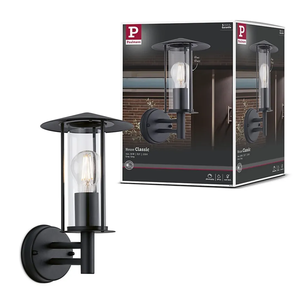 L’applique Classic séduit par son design traditionnel. Avec une puissance de watts, elle illumine les murs extérieurs et éclaire l’entrée de façon homogène et sûrement. L’armature de couleur gris foncé et l’abat-jour en verre clair confèrent une esthétique contemporaine. Les filaments en verre plein conviennent particulièrement comme ampoules à commande intelligente. Le luminaire bénéficie de la protection IP44 qui le préserve spécifiquement contre l’infiltration d’humidité ou de poussière. Selon l’ampoule utilisée, la lampe est dimmable.