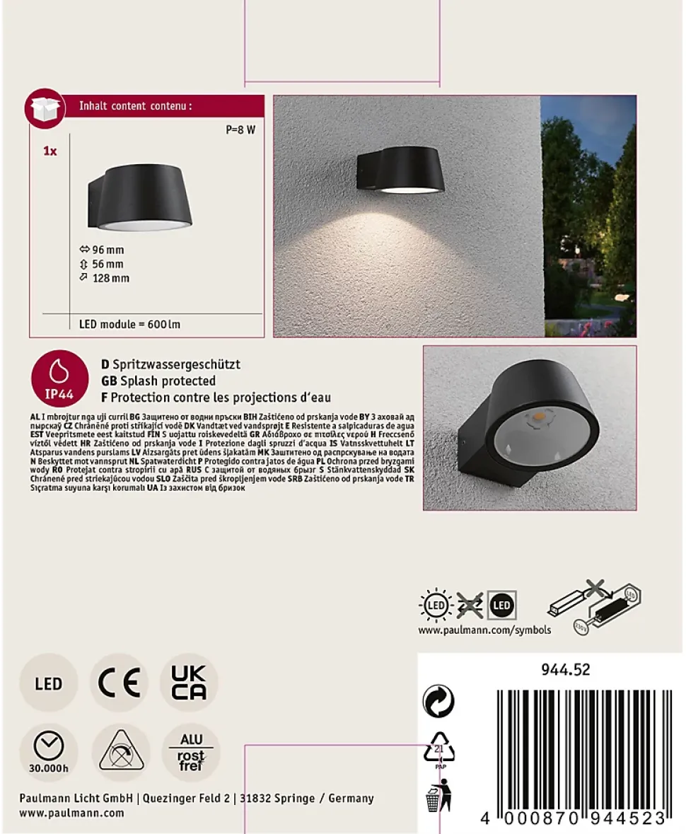 IP44 Protection contre les projections d’eau|Pour des touches lumineuses attrayantes sur les murs extérieurs|Pour raccordement direct au secteur 230V|Température de couleur: 3000K – Blanc chaud