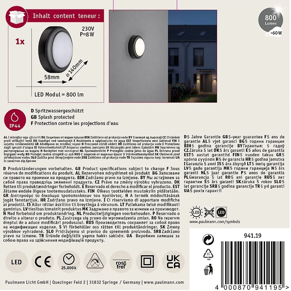 La robuste applique d’extérieur 230 V en plastique d’une puissance de 8 watts éclaire votre entrée de façon homogène et sûre.