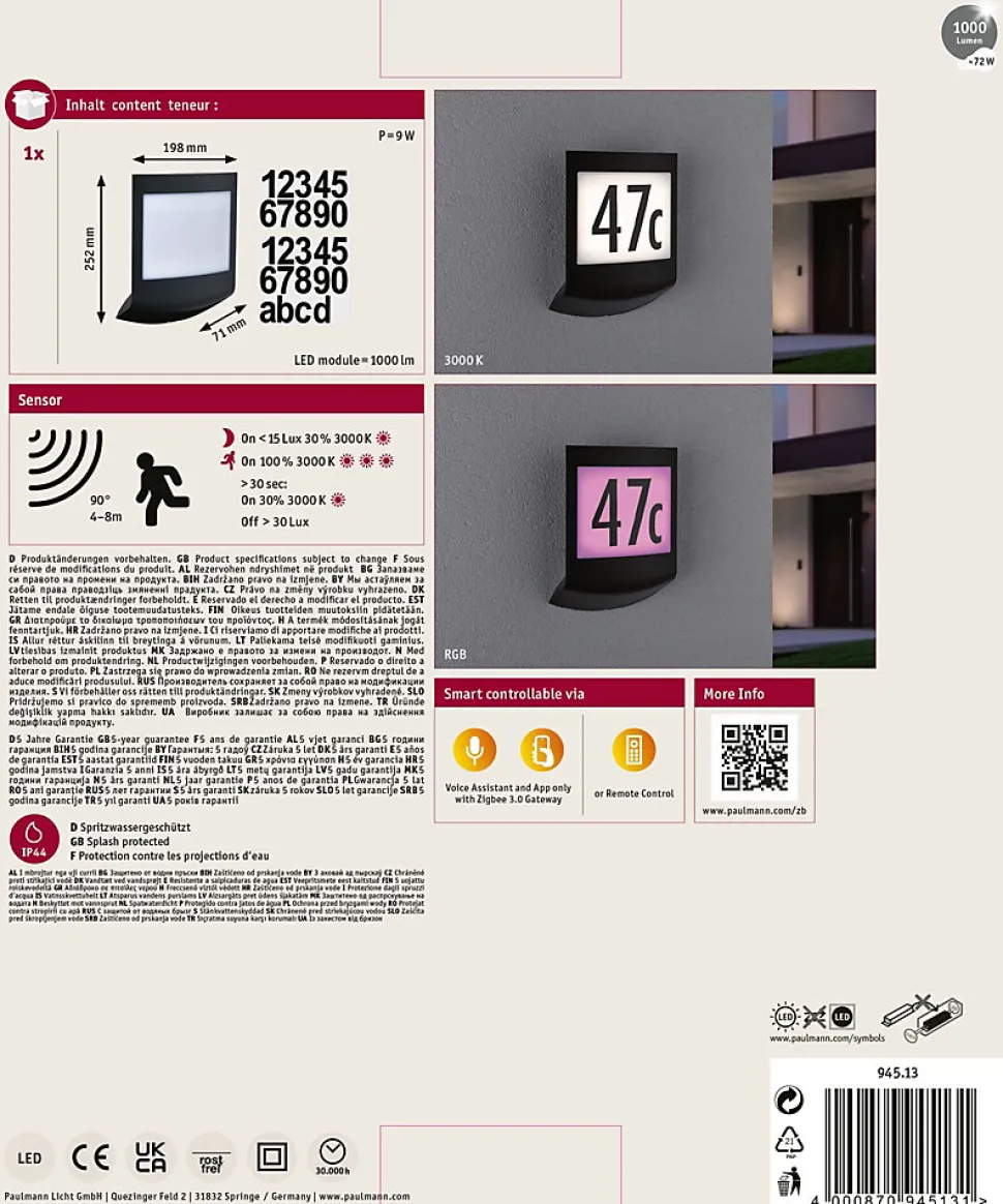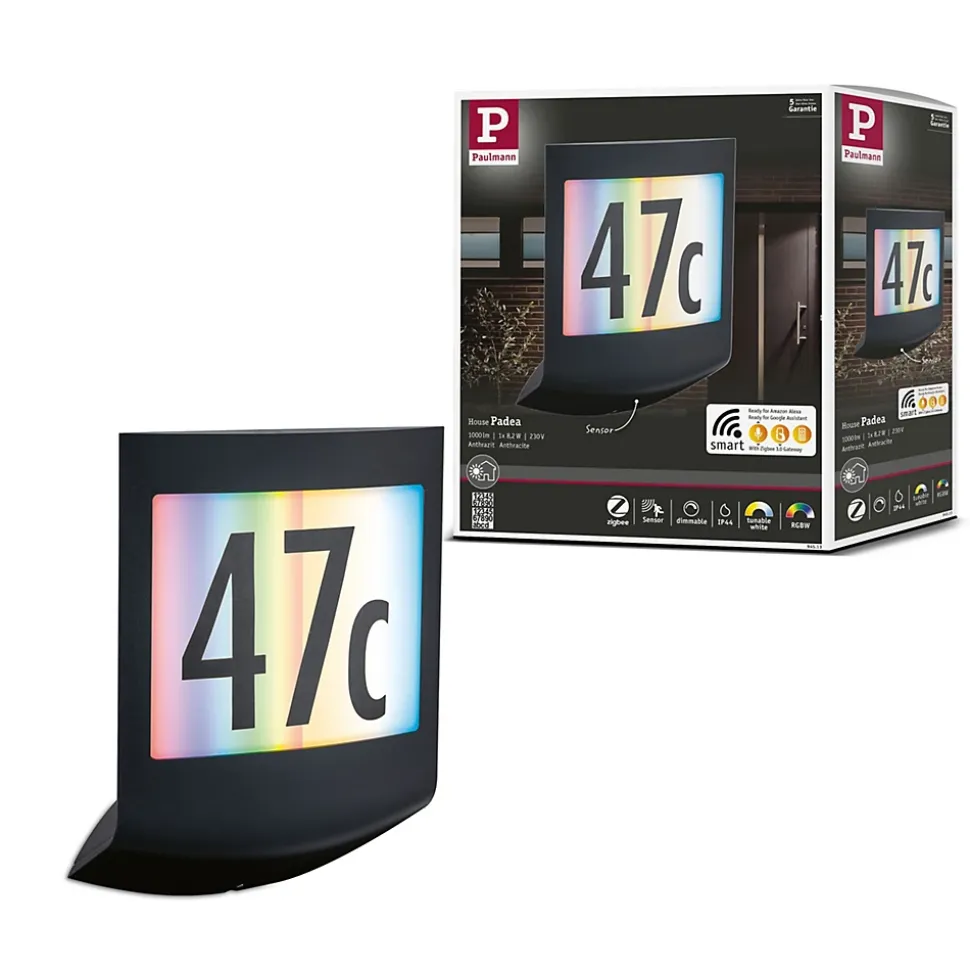 Éclairage extérieur avec couleurs RGBW et Tunable White|Avec un jeu de chiffres et de lettres à utiliser comme numéro de maison lumineux|IP44 – Protection contre les projections d’eau, y compris en extérieur|Grâce à la commande de lumière blanche intelligente Tunable White, vous pouvez régler en continu et personnaliser la température de couleur|La fonction RGBW permet de choisir librement la température de couleur|Convient pour une utilisation à l’extérieur|Pour des touches lumineuses attrayantes sur les murs extérieurs|L’interrupteur crépusculaire ne se met en marche qu’à partir d’un certain degré d’obscurité