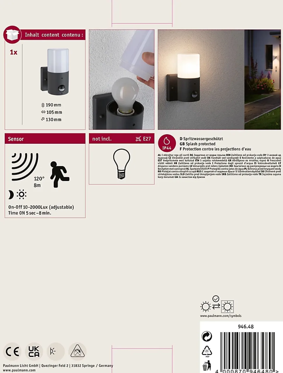 Crée des effets de lumière indirects dans les zones en plein air|Commutation automatique par détecteur de mouvement intégré|Protection IP : IP44 – Protection contre les projections d’eau|Ampoules au choix|Ne pas oublier : Commandez l’ampoule adaptée en même temps !