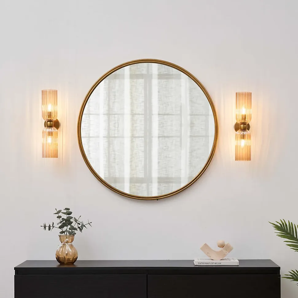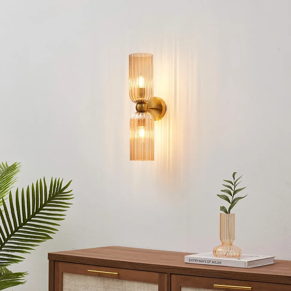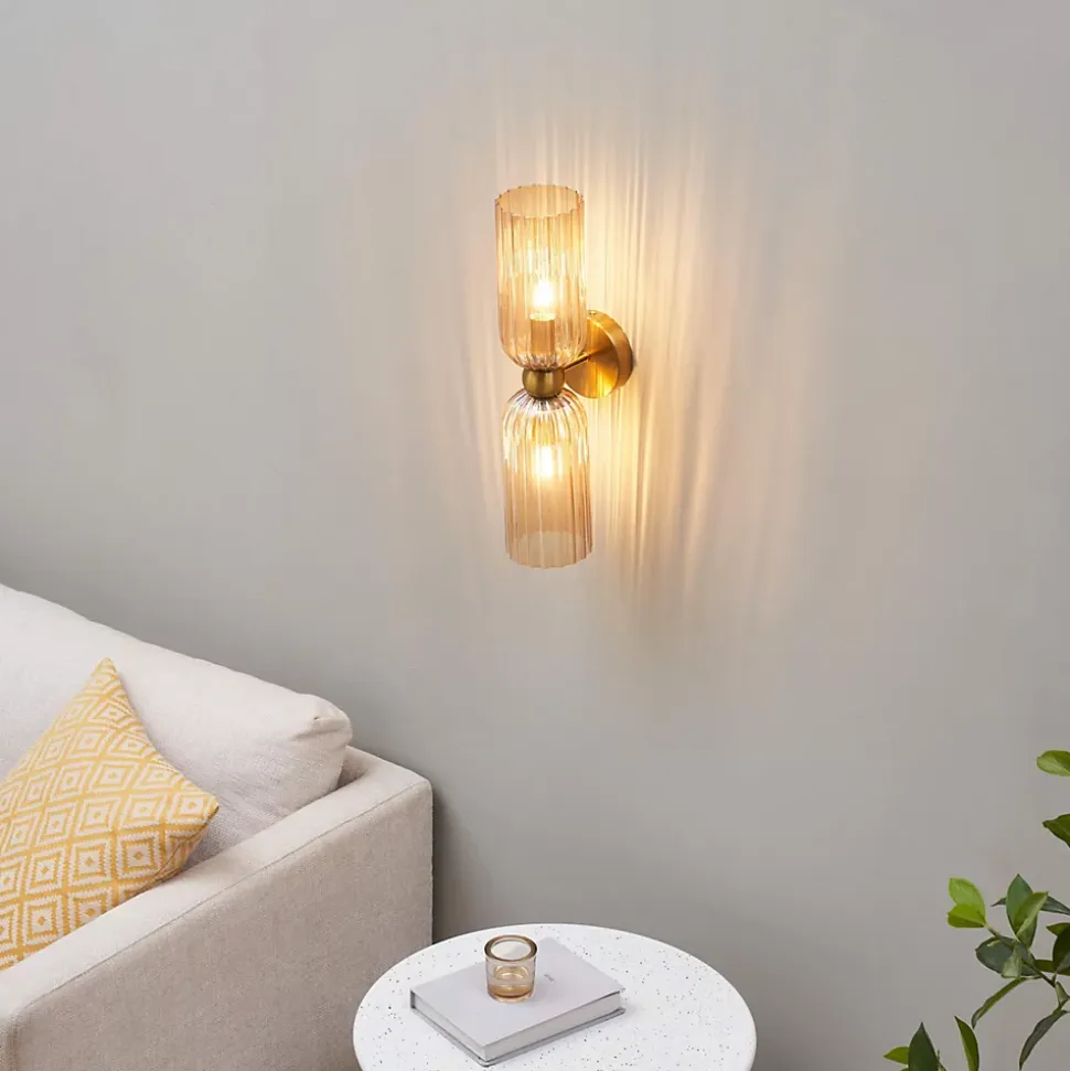 Optez pour l’élégance de l’applique Leonora, au design vintage glamour, avec son socle doré et ses deux verres cylindriques transparents. Elle fonctionne avec deux ampoules E14 (non incluses) et diffuse une lumière embellie par de subtils reflets muraux grâce à ses verres striés. Complétez votre décoration avec la suspension coordonnée de la collection Leonora.) Assemblage simple requis (