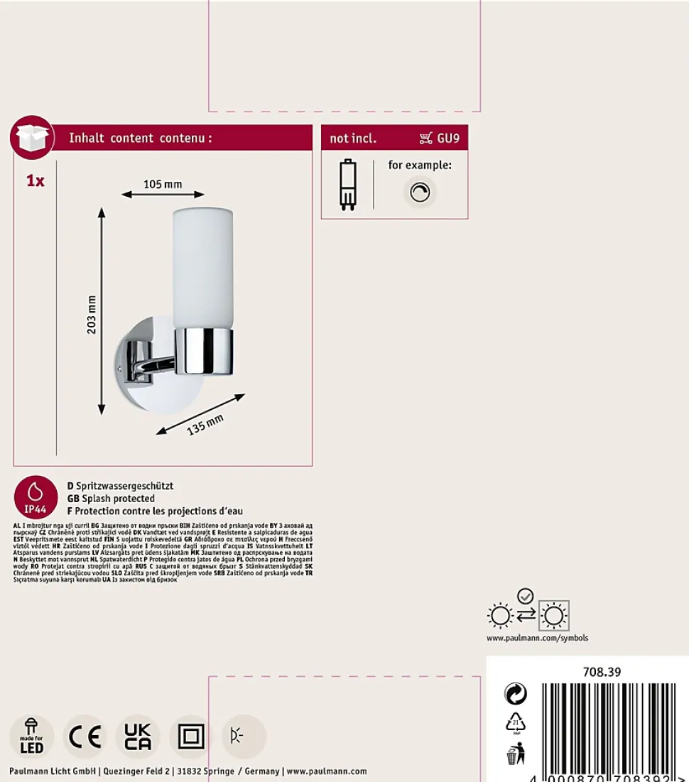 Avec son abat-jour en verre satiné, l’applique Eleon vous garantit une lumière d’ambiance agréable et homogène. Idéale dans les salles de bain ou les pièces humides grâce à sa protection anti-projections d’eau. C’est vous qui choisissez la forme et la couleur des ampoules. Choisissez une ampoule avec culot G9. Selon l’ampoule utilisée, la lampe est dimmable.