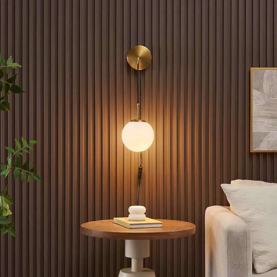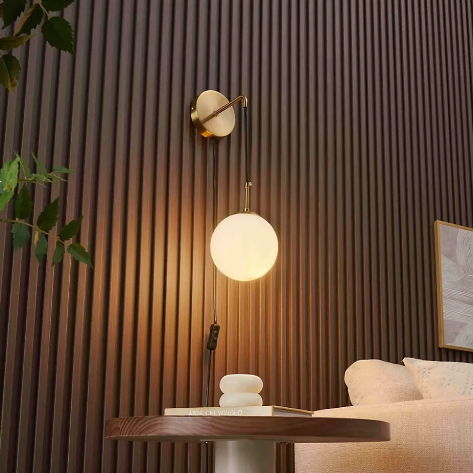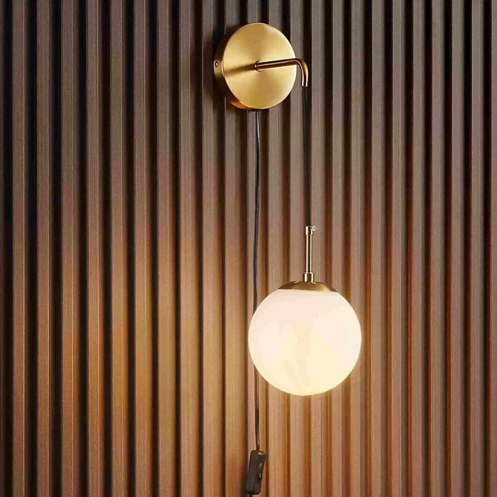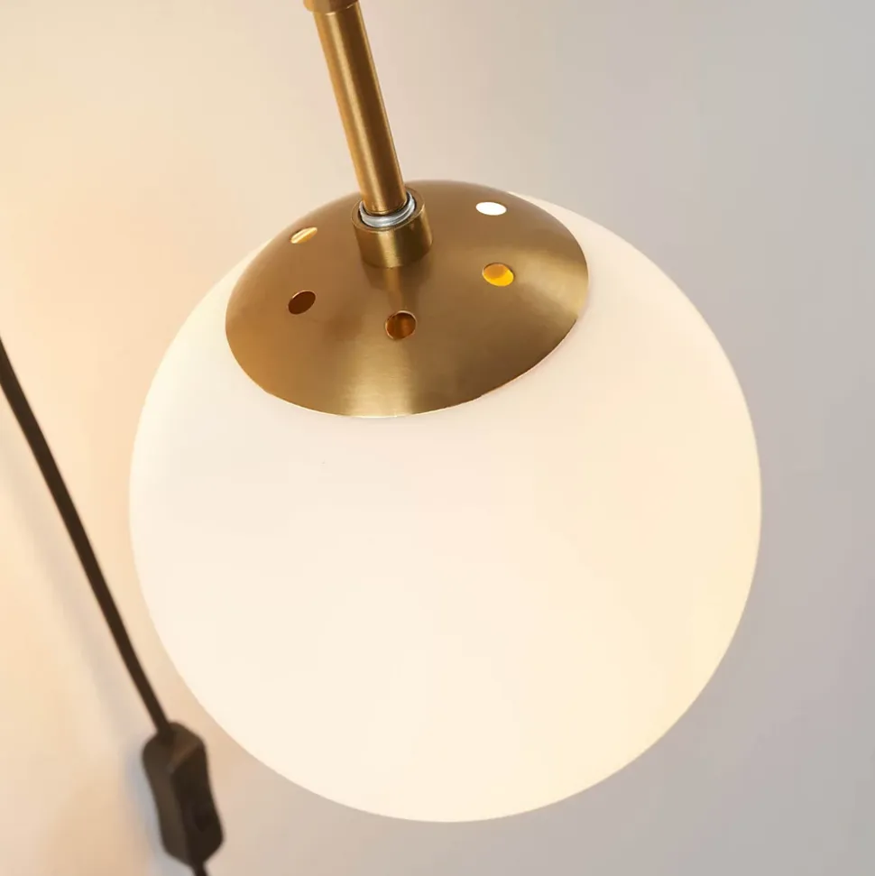Élégante et minimaliste, Robyn mêle harmonieusement métal doré, câble noir et verre blanc opale. Le globe suspendu accueille une ampoule E27 (non fournie) pour un éclairage chaleureux. Grâce à son interrupteur intégré, cette applique chic et fonctionnelle s’adapte parfaitement à une tête de lit ou un coin lecture raffiné.) Assemblage simple requis (