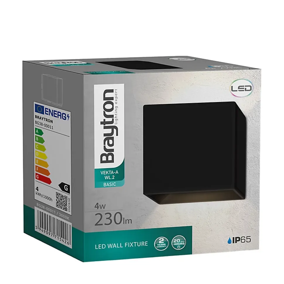 L’applique LED BRAYTRON VEKTA-A, noir, 4W, 230lm, à pour particularité son éclairage indirect du plus bel effet. Idéal pour mettre en valeur la façade de votre habitat tout en sécurisant l’accès à votre domicile. Son installation en saillie est simple et rapide car elle ne nécessite pas de découpe au mur. Ce luminaire doté d’un indice de protection IP65 résiste aux intempéries et convient donc à une installation à l’extérieur. En thermoplastique, cette applique est solide et résistante au UV. L’indice de protection IP65 assure que le produit est : Protégé totalement contre les poussières Protégé contre les projections d’eau à la lance provenant de toutes les directions Attributs : Puissance : 4W Tension : 220-240V – 50/60Hz Lumens : 230lm Indice de protection : IP65 Matière : Thermoplastique Durée de vie : 20000 hrs Largeur : 120mm Longueur : 120mm Profondeur : 52mm Classe de protection : Classe 2 Produit conforme à la norme CE, à la directive RoHS et DEEE.