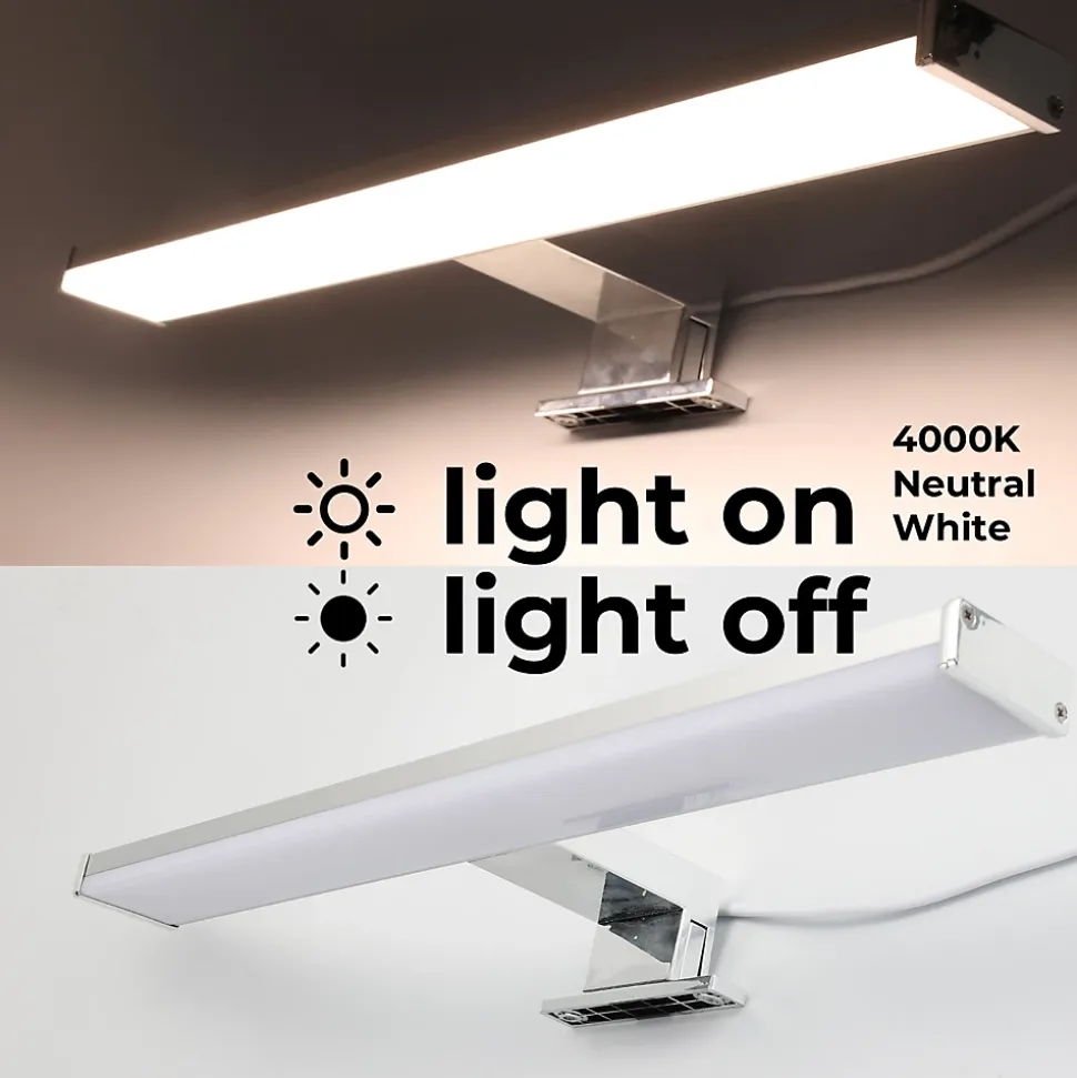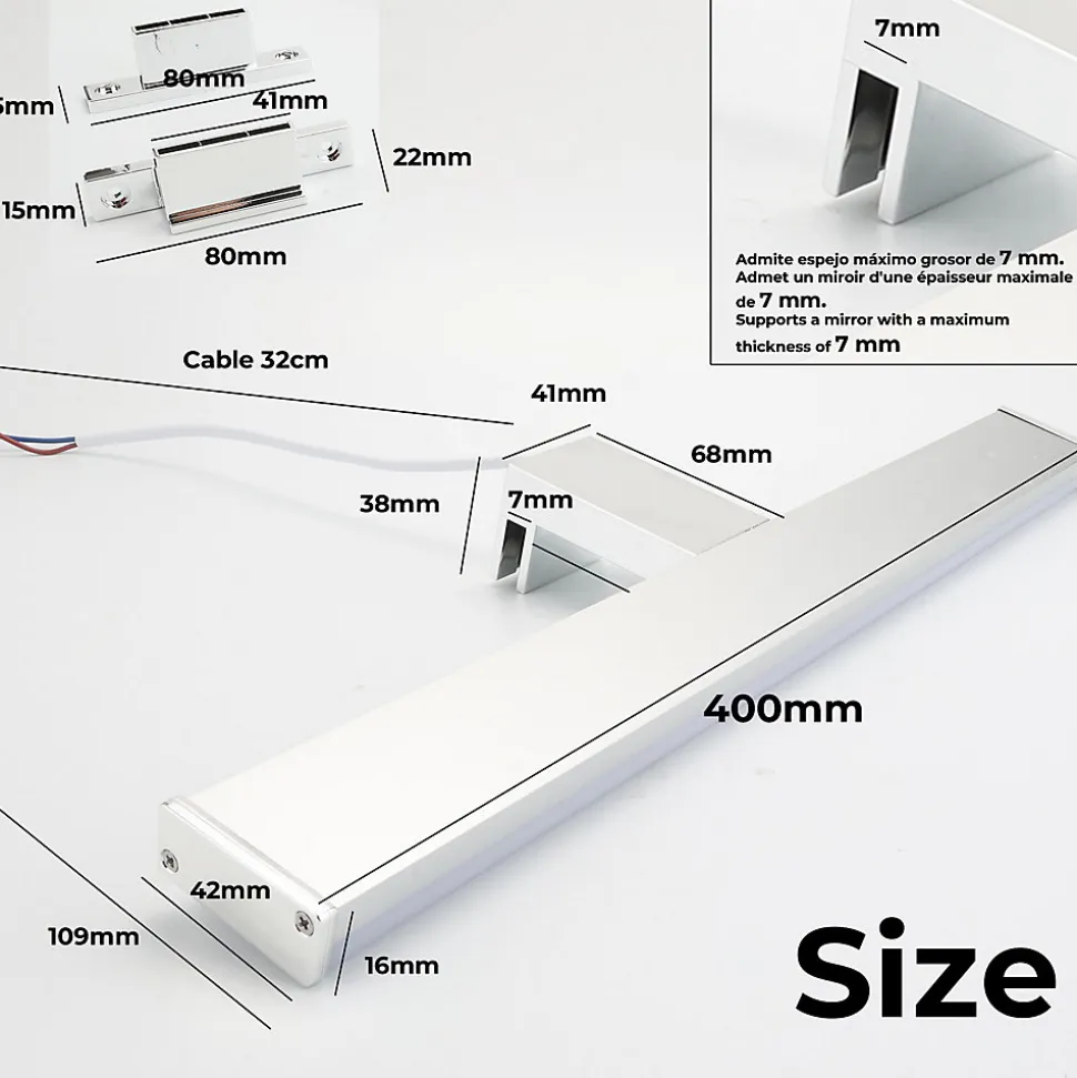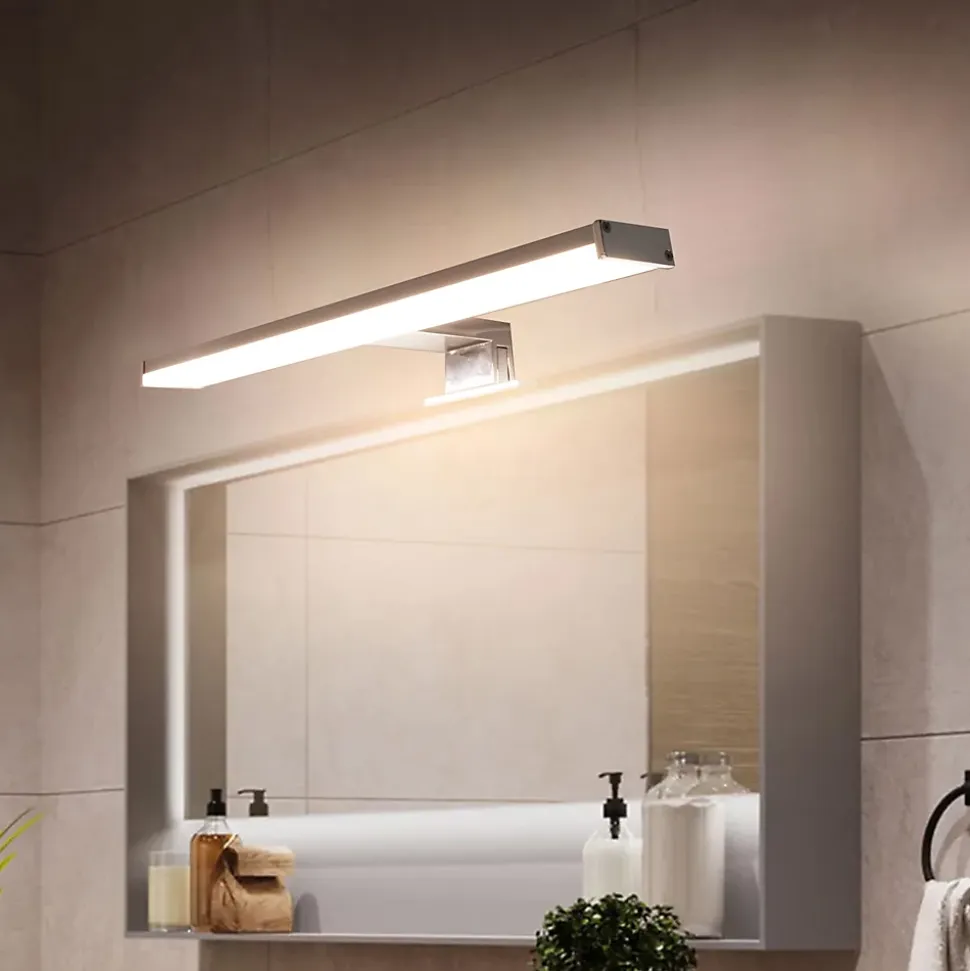 Design et Finition : Applique murale LED pour miroir de salle de bain avec finition chromée mate et style minimaliste. Éclairage : LED intégrée de 10W, lumière blanche neutre 4000K, flux lumineux de 1050 lm. Matériaux : Fabriquée en aluminium et polycarbonate, résistante à l’humidité et aux éclaboussures (IP44). Options d’installation : Encastrée sur le miroir Fixée sur le meuble Montée au mur Dimensions : 110 x 40 x 400 mm Efficacité : Équipée de puces LED SMD2835 pour une meilleure efficacité, stabilité, dissipation thermique et longue durée de vie. Idéale pour les salles de bain, offrant un éclairage intense et précis au-dessus des miroirs.