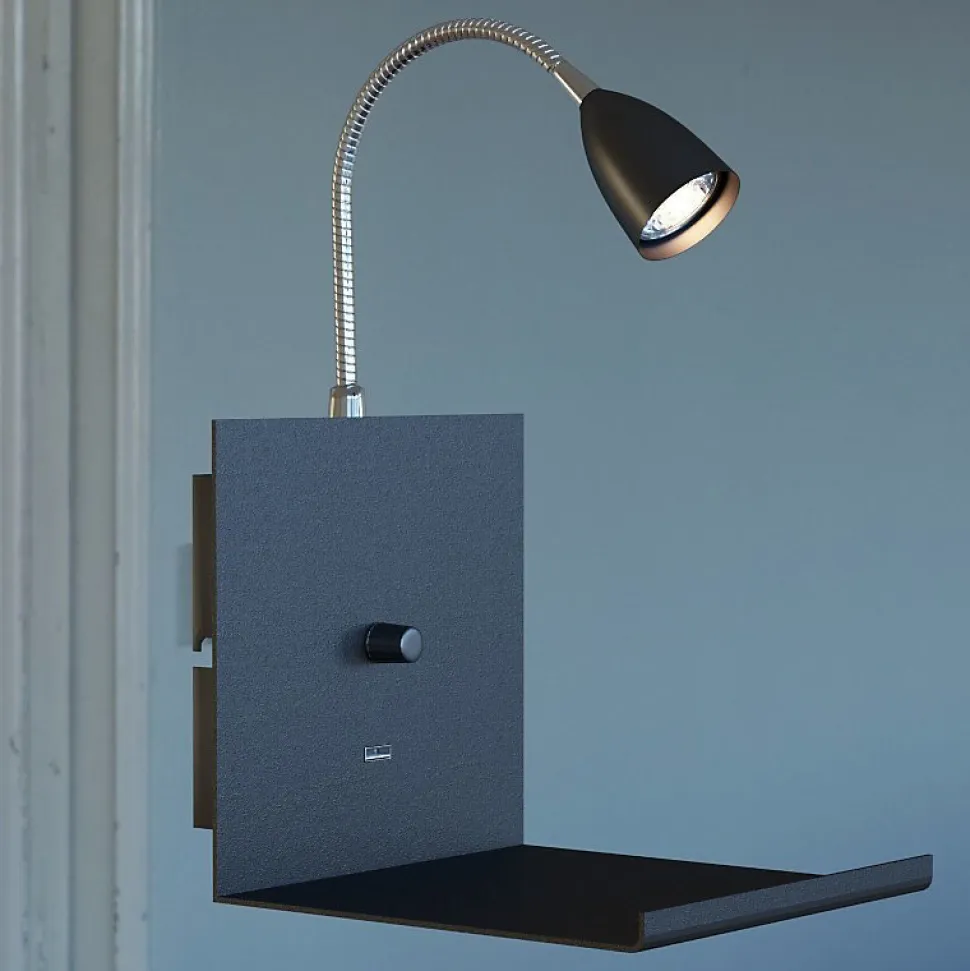 Les caractéristiques techniquesL’applique murale intérieure Logi de Markslöjd est constituée d’une platine et d’un abat-jour en métal noir et d’ un flexible chromé qui vous permettra de choisir la zone à éclairer.Sa prise USB vous permet de recharger vos objets connectés.Elle fonctionne avec une ampoule GU10 7 watts maximum (non fournie).Vous avez la possibilité de régler l’intensité lumineuse (à condition d’équiper l’applique d’une ampoule dimmable) grâce à son variateur. Les avantages esthétiquesVous apprécierez l’esthétique simple et le côté pratique de l’applique Markslöjd Logi noire.De par ses formes épurées, cette applique s’harmonisera avec tout type de décoration.Côté pratique, vous apprécierez particulièrement :- la prise USB vous permettant de recharger vos objets connectés- la fonction étagère (20 cm x 15 cm) où vous pourrez déposer votre portable lors du rechargement ou un objet décoratif.Logi existe en noir ou en blanc.