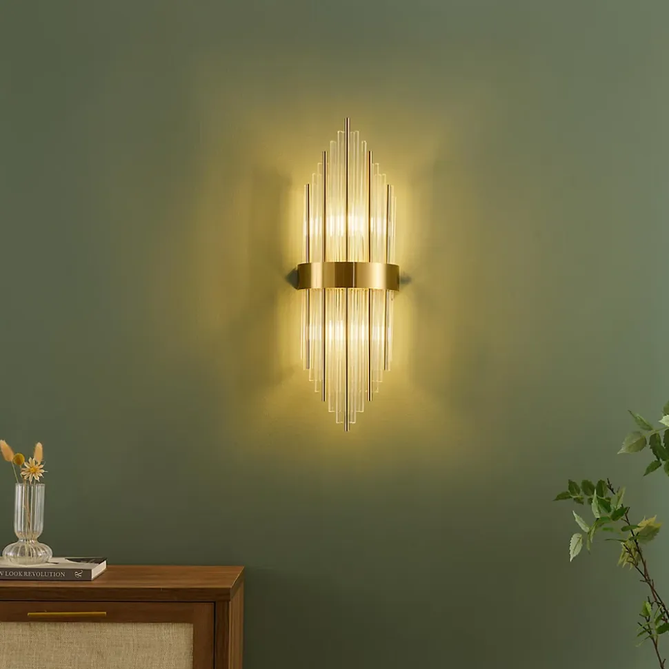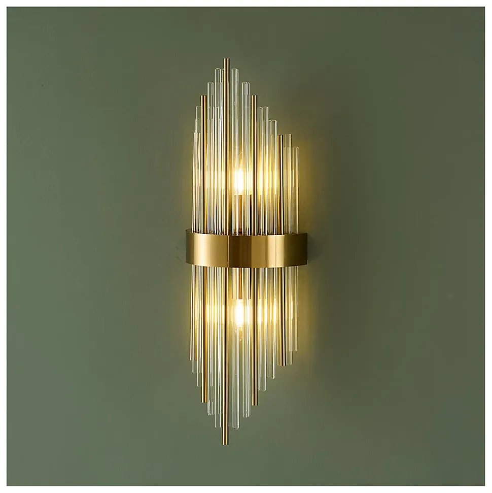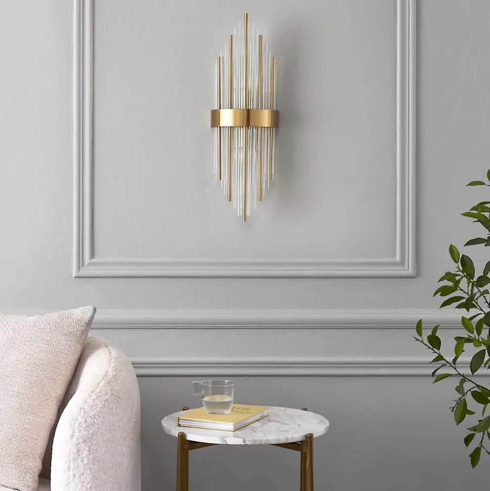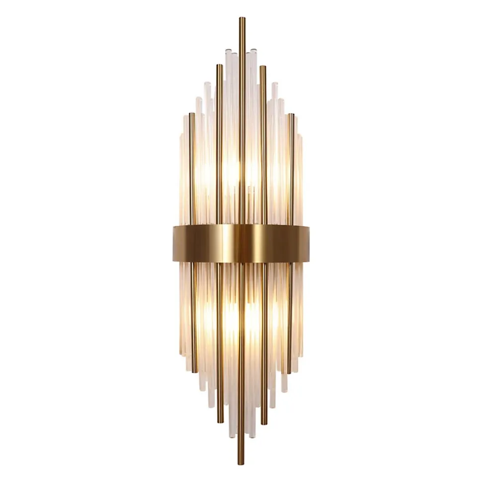 L’applique murale Dania, avec sa finition dorée, est une pièce exceptionnelle qui marie à la perfection design et praticité. Ses tiges en verre transparent apportent une lumière diffuse et élégante, idéale pour créer une atmosphère chaleureuse. Grande et imposante, elle transforme instantanément votre mur. Ce modèle doit être complété par 2 ampoules E14.) Assemblage à faire par vos soins (
