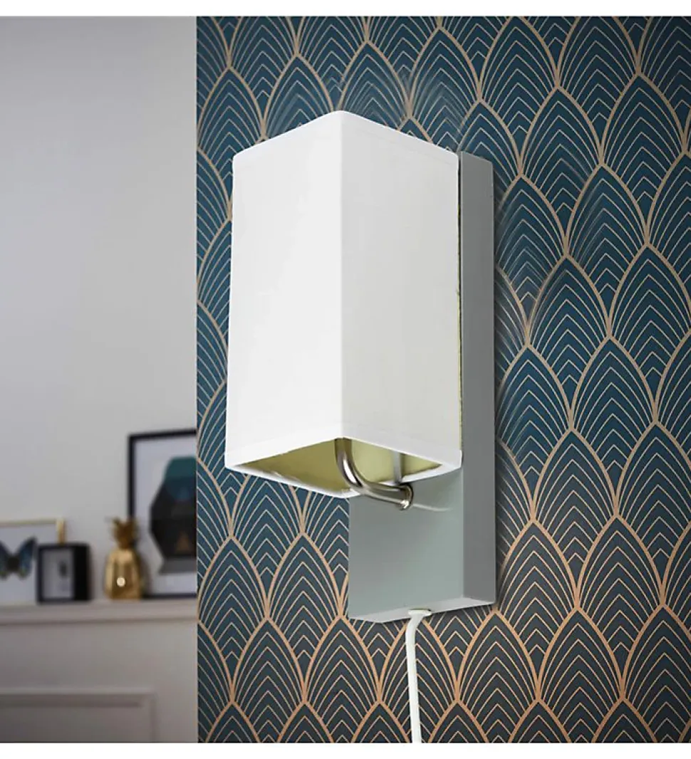 Applique murale 1 spot abat-jour blanc et socle en métal gris.Cette applique murale avec un abat-jour blanc sera une source discrète de lumière pour votre intérieur.Cette applique abat-jour blanc trouvera parfaitement sa place au-dessus de votre lit ou dans un couloir.L’applique mural est équipée d’un câble d’alimentation avec un interrupteur marche / arrêt.Descriptif :Couleur : Blanc et grisMatériau : métal et papierUsages spécifiques : Usage intérieur uniquementDimensions (H x L x P) : 25 x 9 x 12 cmPoids : 490 gCaractéristiques techniques :Type d’ampoule compatible : Halogène 28 W / CFL 32 WType de culot : E14Ampoule incluse : NonPuissance : 7 Watts maxiVolt : 220/230Branchement : prise électrique muni d’un interrupteur marche / arrêtOptez pour l’ élégance de cette ligne cubique sobre mais design apportée par le socle en métal alu.Cette applique murale avec abat-jour blanc tamisera la lumière pour une ambiance douce et cosy. Aucune installation électrique n’est requise puisqu?il suffit de brancher le cordon électrique sur vos prises électriques murales