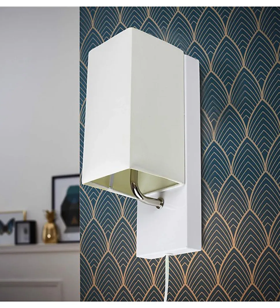 Applique murale 1 spot abat-jour blanc et socle en métal blanc.Cette applique murale avec un abat-jour blanc sera une source discrète de lumière pour votre intérieur.Cette applique abat-jour blanc trouvera parfaitement sa place au-dessus de votre lit ou dans un couloir.L’applique mural est équipée d’un câble d’alimentation avec un interrupteur marche / arrêt.Descriptif :Couleur : BlancMatériau : métal et papierUsages spécifiques : Usage intérieur uniquementDimensions (H x L x P) : 25 x 9 x 12 cmPoids : 490 gCaractéristiques techniques :Type d’ampoule compatible : Halogène 28 W / CFL 32 WType de culot : E14Ampoule incluse : NonPuissance : 7 Watts maxiVolt : 220/230Branchement : prise électrique muni d’un interrupteur marche / arrêtOptez pour l’ élégance de cette ligne cubique sobre mais design apportée par le socle en métal alu.Cette applique murale avec abat-jour blanc tamisera la lumière pour une ambiance douce et cosy. Aucune installation électrique n’est requise puisqu?il suffit de brancher le cordon électrique sur vos prises électriques murales