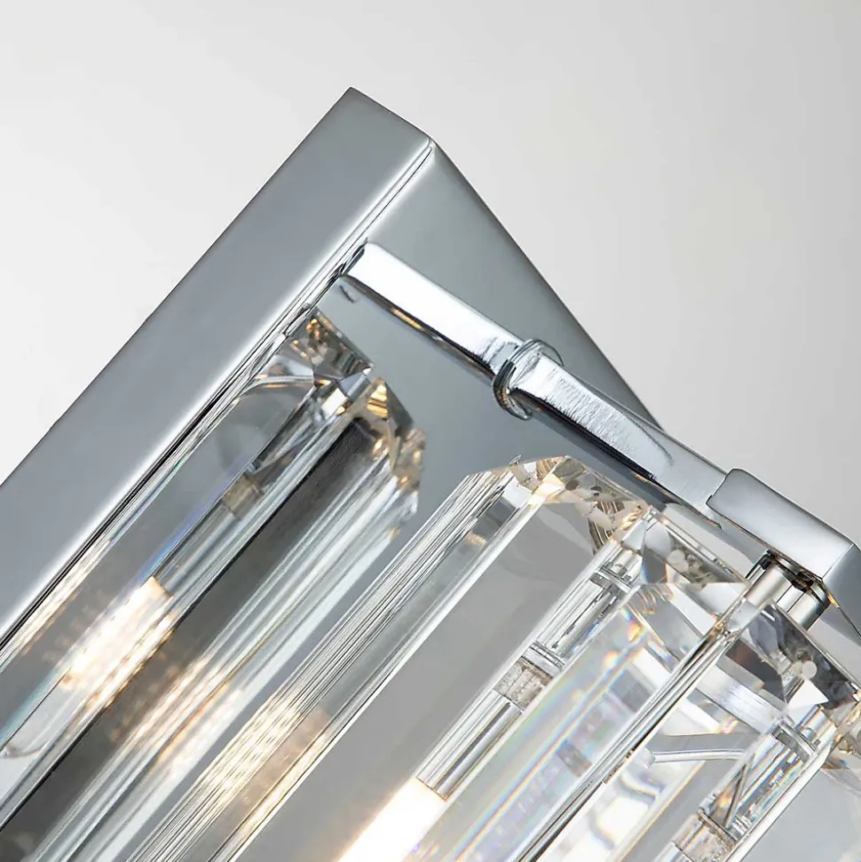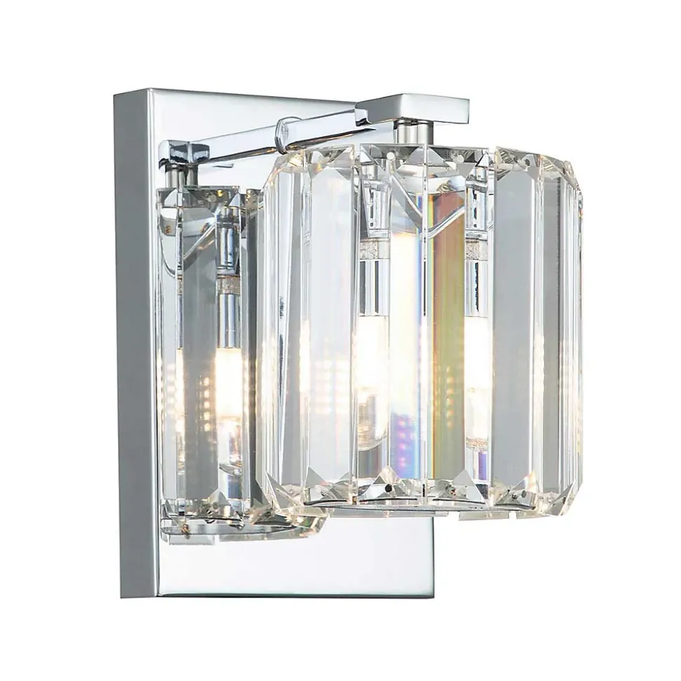 L’applique murale Divine 1 lumière est d’une sophistication exquise. La plaque arrière simple brille en chrome poli et reflète chaque coupe et chaque éclat du verre de cristal. Le verre réfracteur est disposé en lamelles épinglées en haut et en bas pour former un abat-jour autour de l’ampoule LED. Elle est classée IP44 pour la salle de bains.